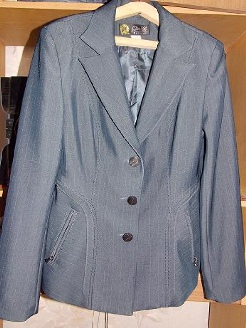 1. серый в тонкую полоску с широкими брюками на размер 44-46, материал полиэстер, цена 350 рублей, цвет несколько темнее, чем на фото.