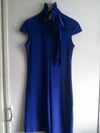Новое праздничное синее платье с коротким рукавом, воротником-стойкой и бантом на шее, размер 44-46 (эластичное, покрой чуть расклешенный). Цена 1000 руб.