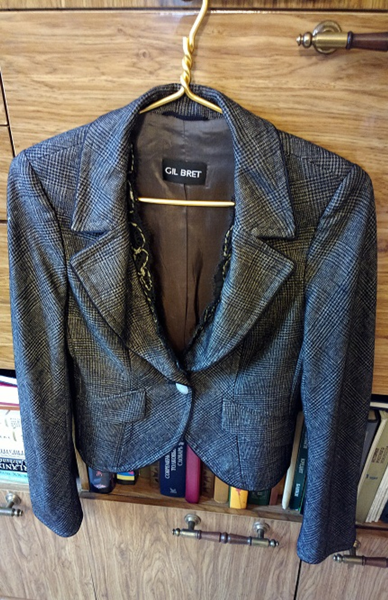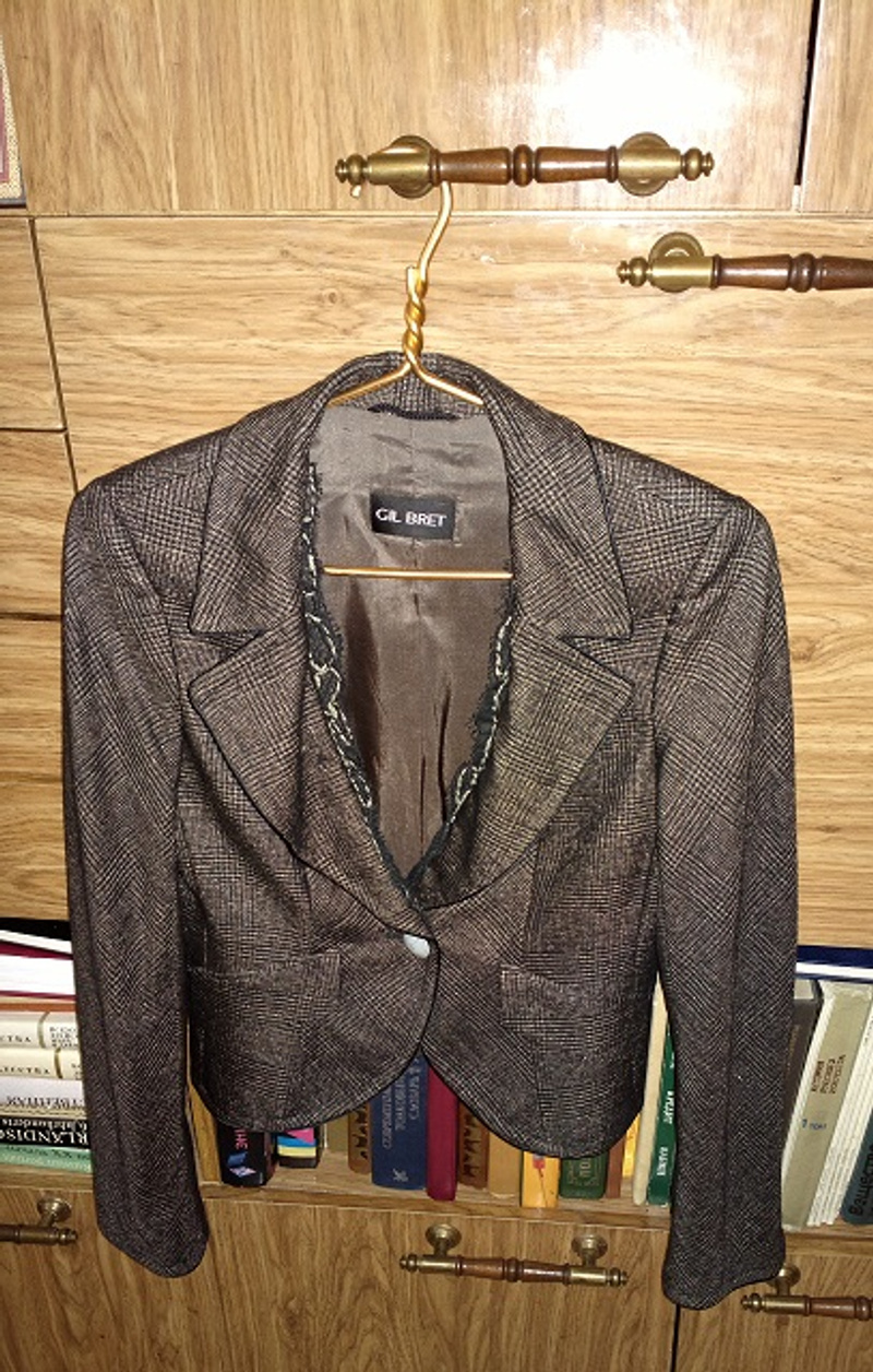3)пиджак, очень хорошее состояние, размер 38 на рост 170, 50 % полиэстер, 48% хлопок, 2% эластан. Цена 300 рублей. 8-953-869-31-88