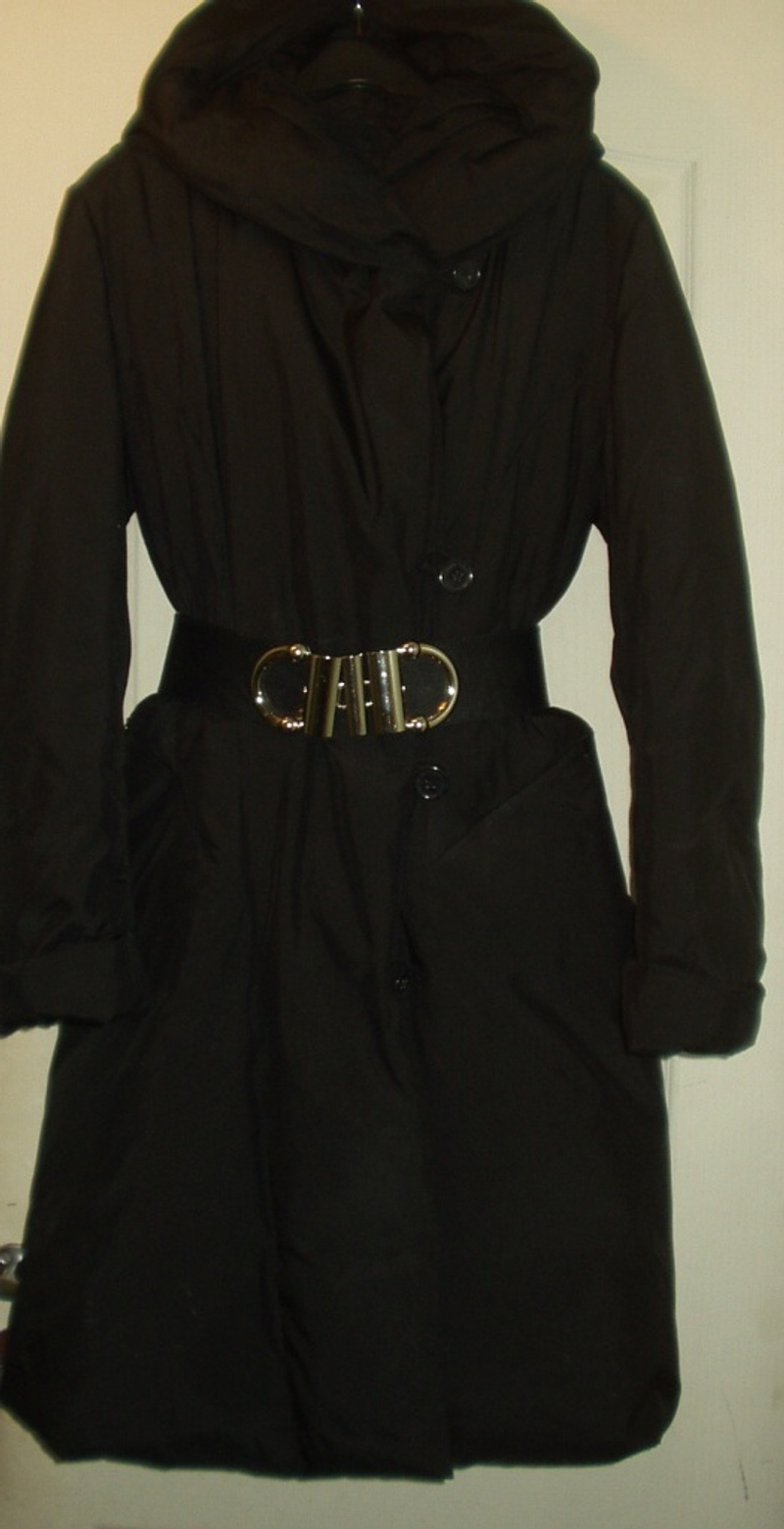 за счет фасона и на животик пойдет, носить можно и с ремнем, ношена аккуратно в сочетании с дубленкой и пухом, длина примерно 90-95 см по спинке, капюшон двойной,