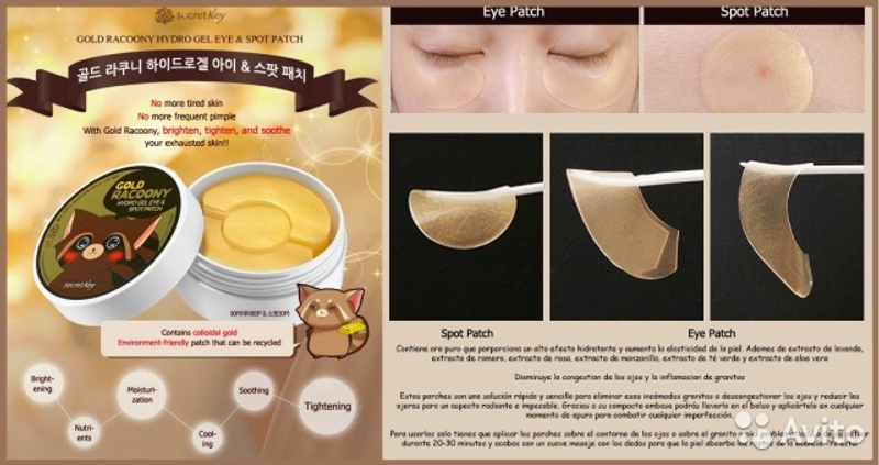 1. Продам 2 упаковки гидрогелевых патчей с золотом для глаз от темных кругов и наклейки для проблемных участков кожи Secret Key Gold Racoony Hydro Gel Eye& Spot Patch