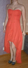 1. Оранжевое платье, размер 42, для груди не меньше 2ки. На фото 88-67-90. Длина спереди 65см, сзади 105см (мерила по шву), одето 1 раз, Цена 300руб. Есть лямки.