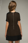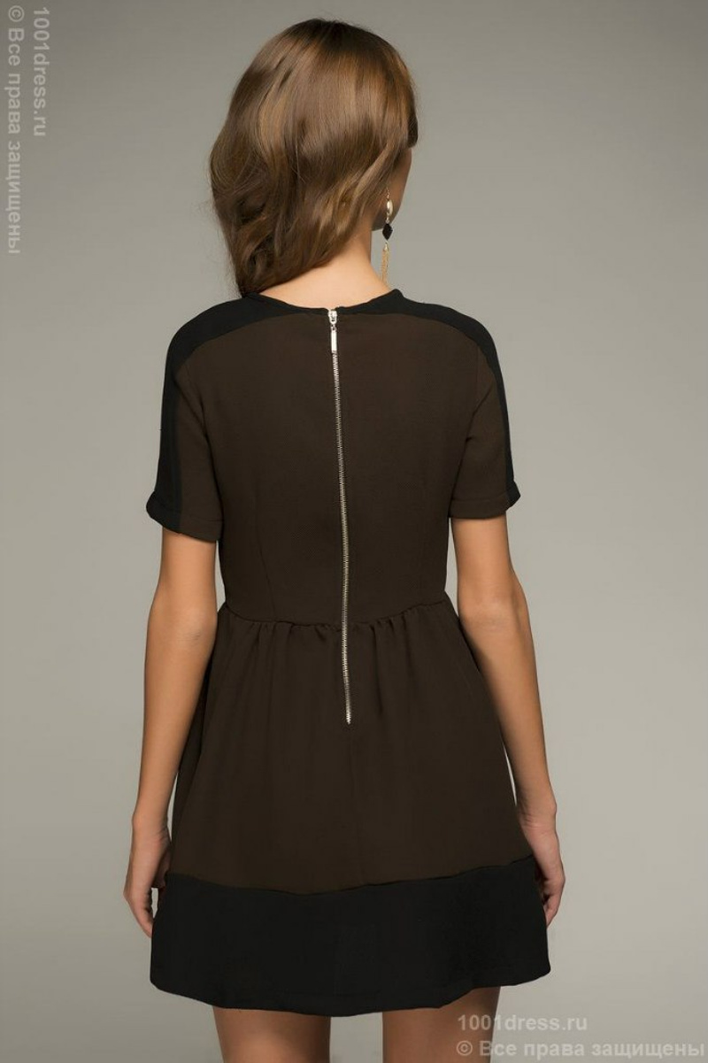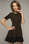 1) Платье короткое шоколадное с широкой черной полосой по подолу, ткань - плотный трикотаж (тянется), размер 44, но можно и на 46 пробовать, думаю, нормально будет. Цена на сайте 2490 руб.