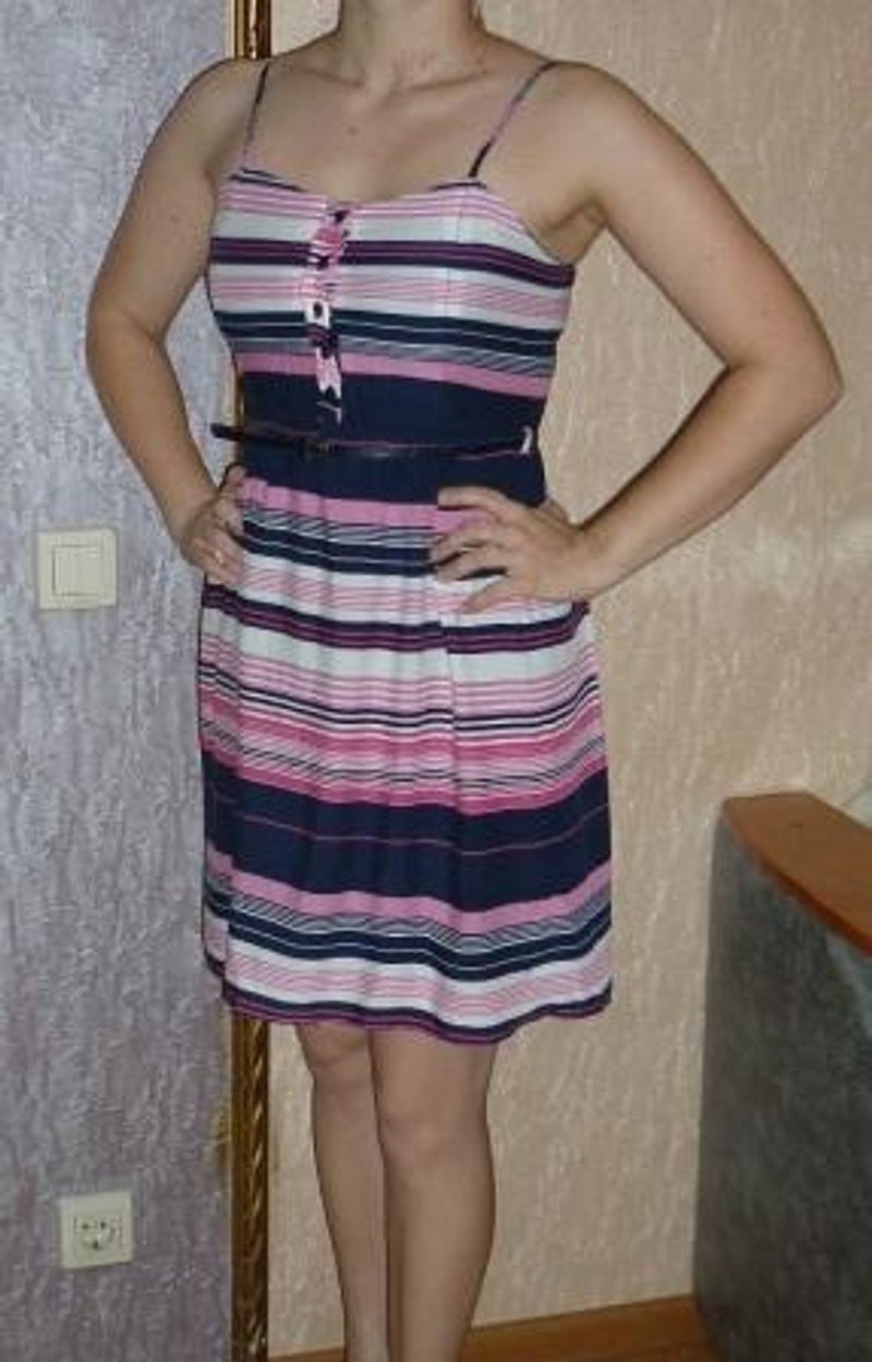 2. Платье в полоску. Новое, размер 36. Общая длина 64см, пот 34см. Лямки регулируются. Есть ремешок. Цена 300руб.