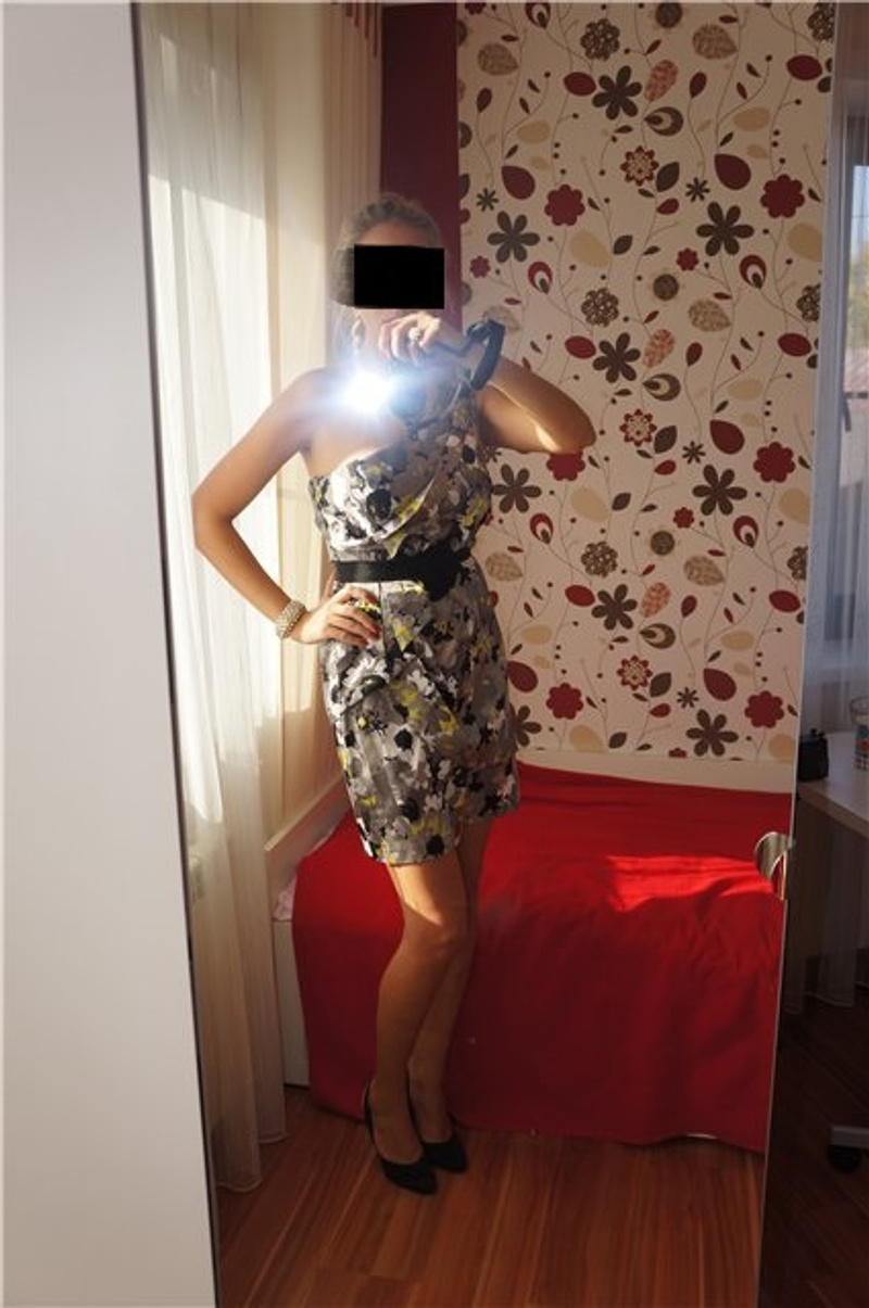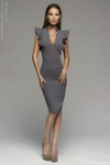 2) Серое платье-футляр с воланами на плечиках, материал - плательная ткань, сзади - потайная молния, размер 42, на 44 уже не подойдет. Цена на сайте 3500 руб.