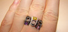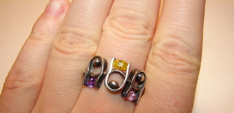 2.Кольцо серебро с 3мя фианитами: розовый, желтый, фиолетовый. Размер примерно 18. 100 руб.