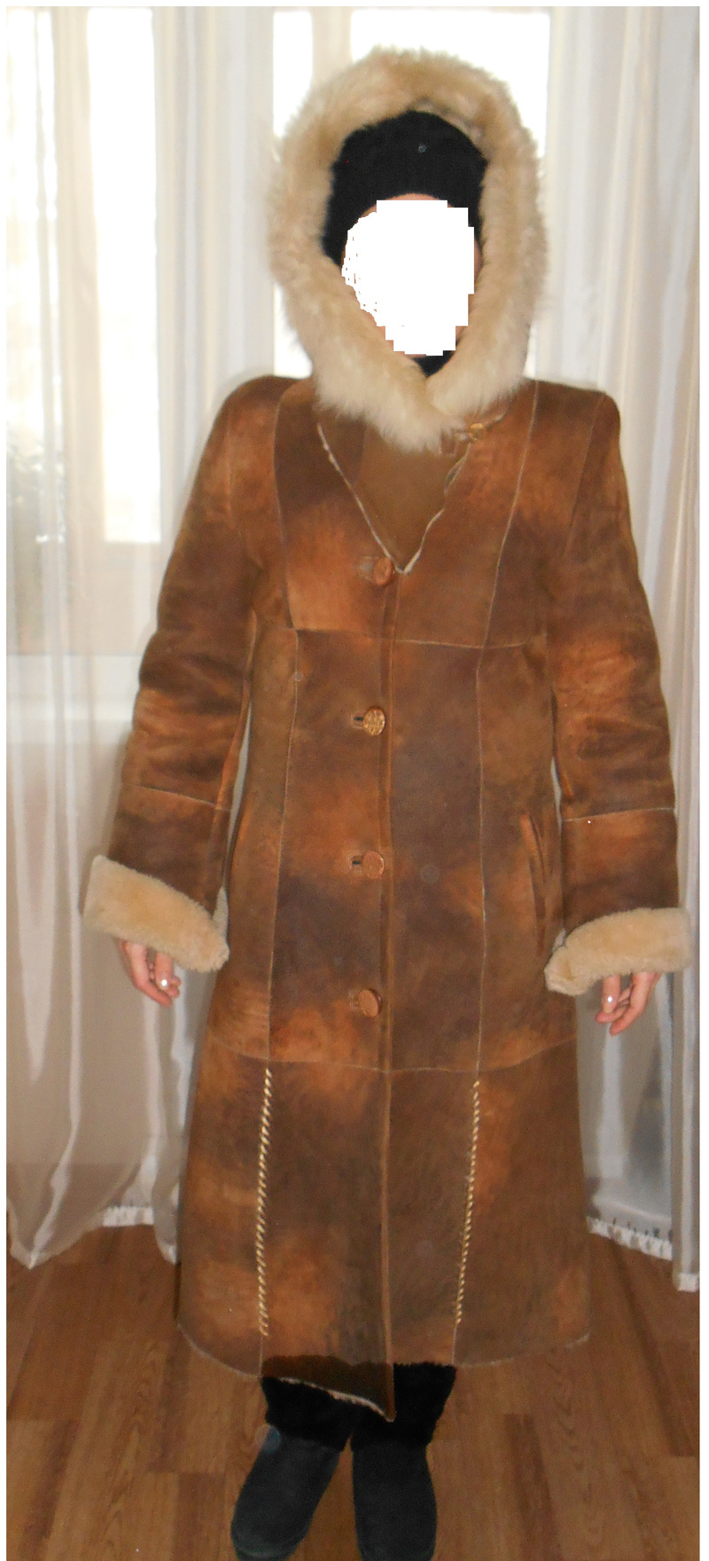 Дубленка из натуральной кожи, мех натуральный, бежево-коричневая. Очень теплая. Длина по спинке 109см. , ширина по спинке 46 см,состояние хорошее. 2000 руб