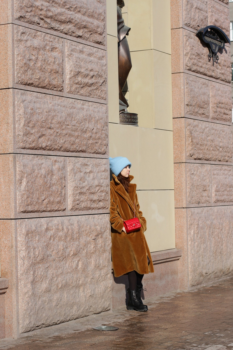Шапку бы сливочную тогда сюда, а сумку - оливковую.Вот такое цветовое решение на мой взгляд удачней бы было