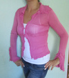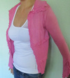 Кофточка нежно-розового цвета с жемчужными пуговками.