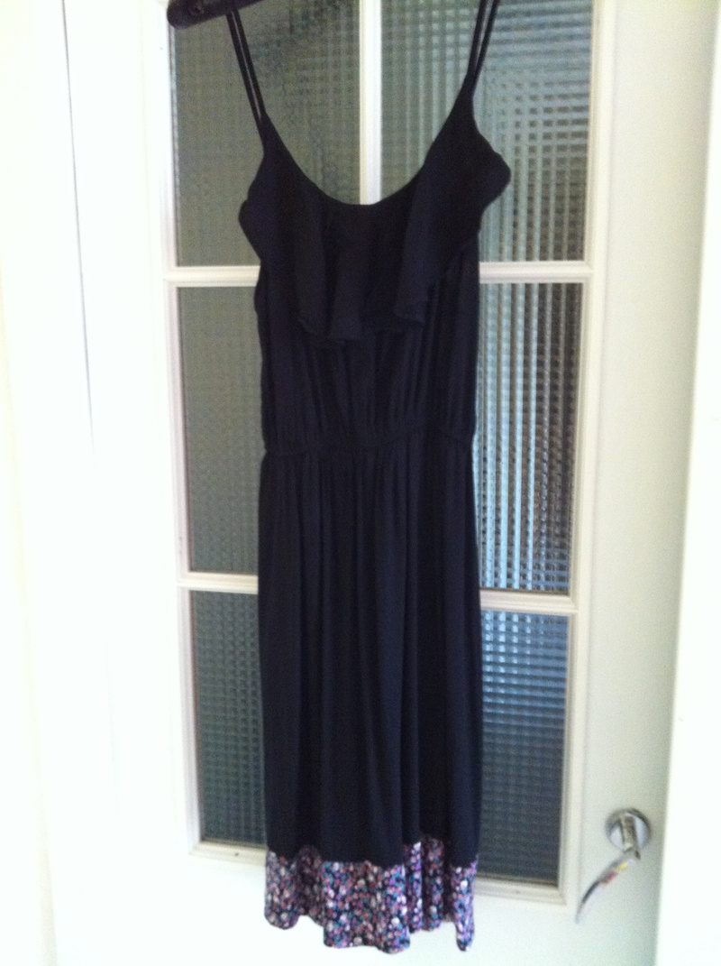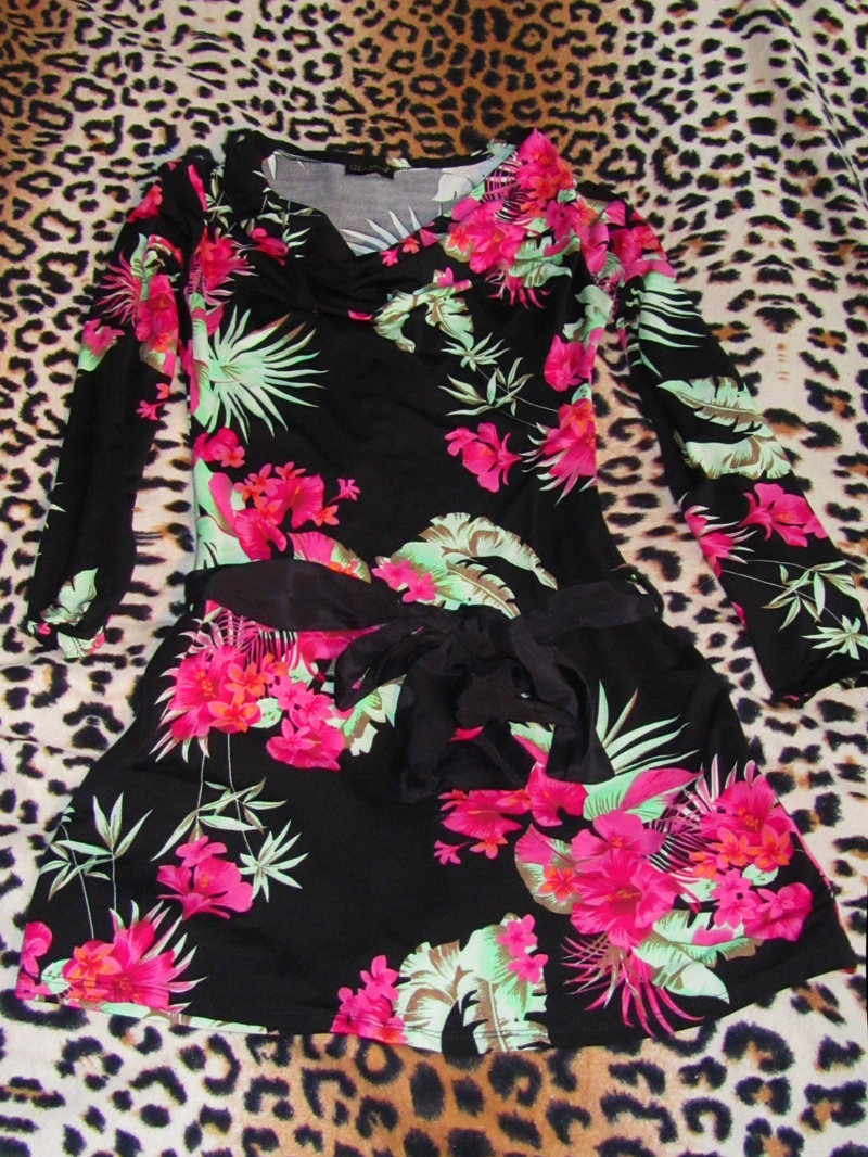 3)Платье черное с розово-салатными цветами, размер 44. Ткань стрейч-синтетика, облегает по фигуре, юбка свободная. На бедрах пояс. 600 рублей