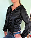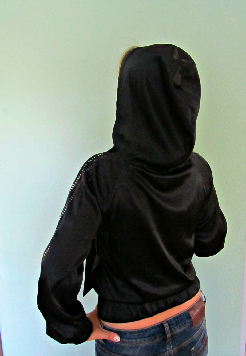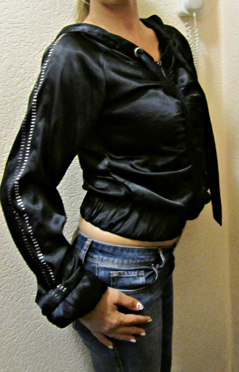 Кофта-курточка р. 42-44 атласная черная, легкая (без подклада). Молодежная, на молнии, с капюшоном. На рукавах 2 ряда страз. Несколько страз отсутствует, поэтому цена невысокая. 380 руб без торга