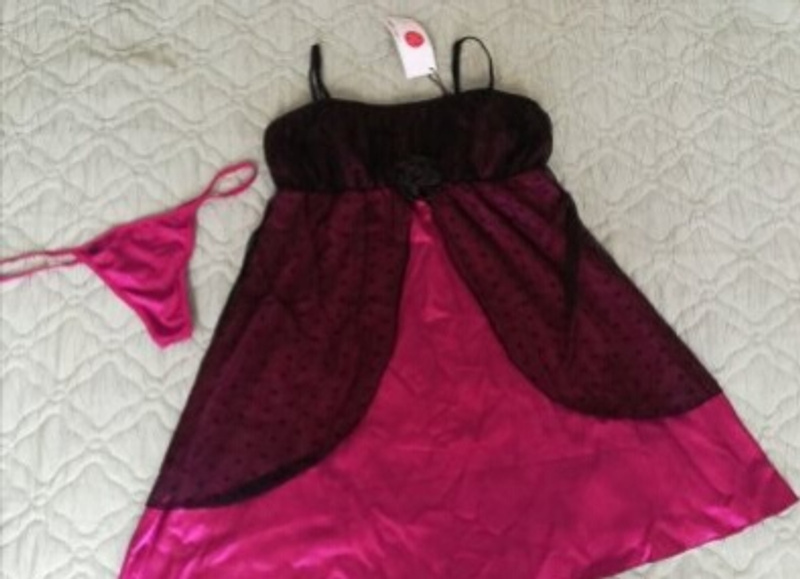 Новый комплект: комбинация в стиле бэбидол, стринги. Размер L/XL указан, но сильно маломерит, на 44-46 размер, на невысокий рост. Длина без бретелек 61см, бретельки регулируются. Цвет фуксия. Этикетка, коробка все на месте. 100% полиэстер. Замеры по запросу, цена 1 тыс.р.