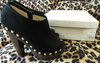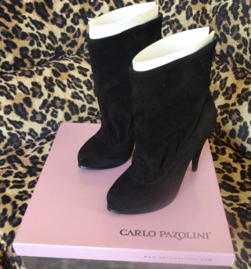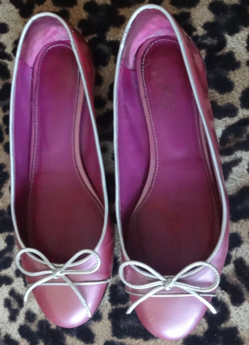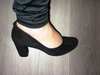 Отличные туфли. Натуральная замша, стелька кожа. Надевались несколько раз, это видно по подошве и набойкам. Сзади отделка черными стразами, немного пооблетали, но это в носке абсолютно незаметно.