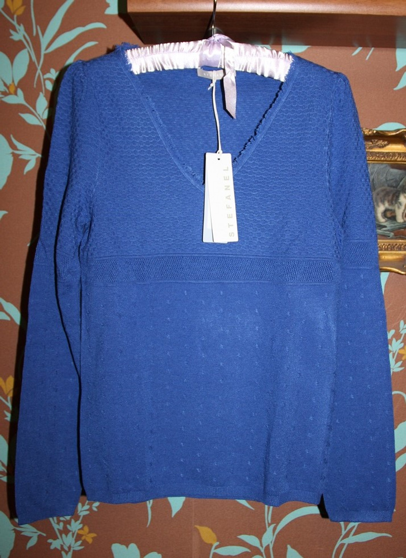 Новый джемпер STEFANEL ( Италия) размер итал. L на наш 40-46 Состав 68 вискоза, 18 шерсть, 14 п/эстер. выкупался через орга и посредника на фр Vente Красивый и уютный имеет 3 вида декоративной вязки, немного присборен по окату рукавов, отделка бахромой по горловине, рукав на небольшом манжете. В реале белесого пятна нет .