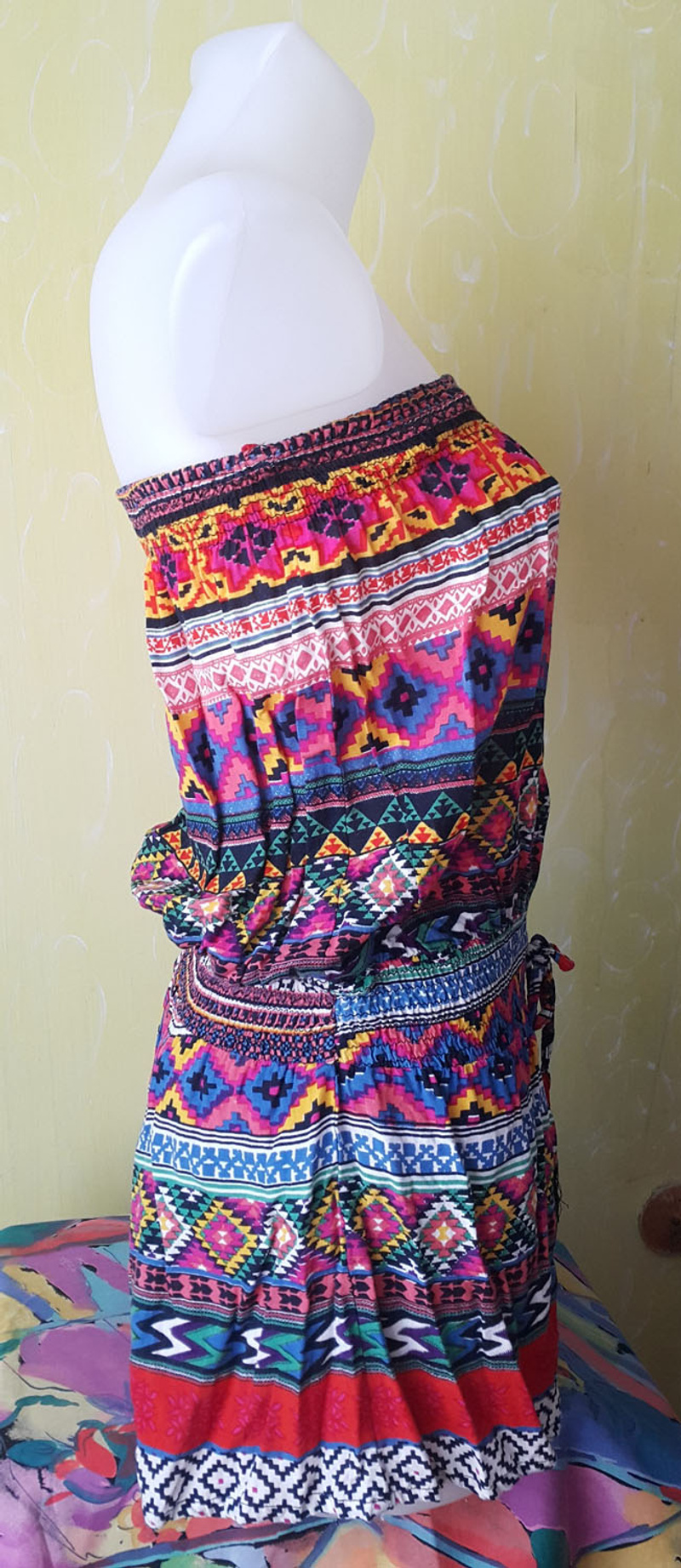 Замеры: по груди от подмышки до подмышки полуобхват 64 см. Бедра по самому нижнему краю, не считая разрезов и завязок полуобхват 69 см.
