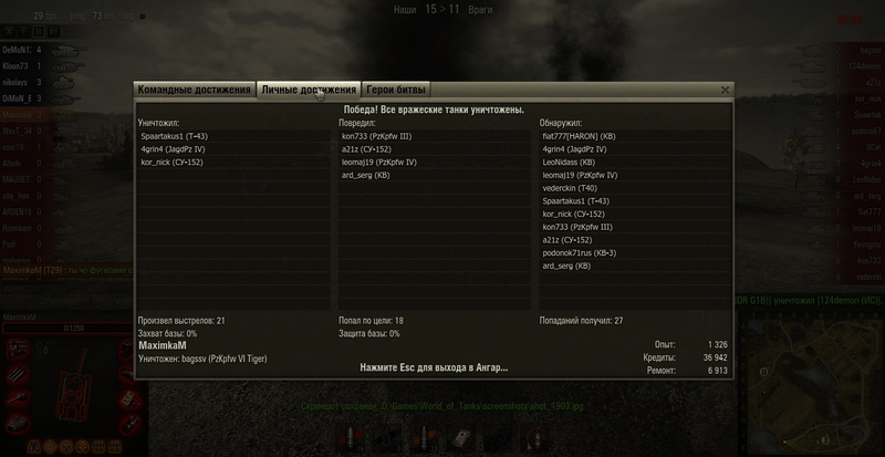 Воин, Снайпер, Стальная стена, медаль Бельтера, Коса смерти, 8 фрагов, 9-го упустил.