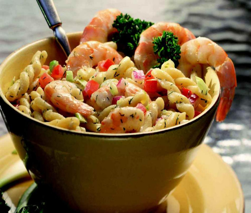 4. Готовую пасту и отваренные креветки также положите в майонезный соус с помидорами, перемешайте.