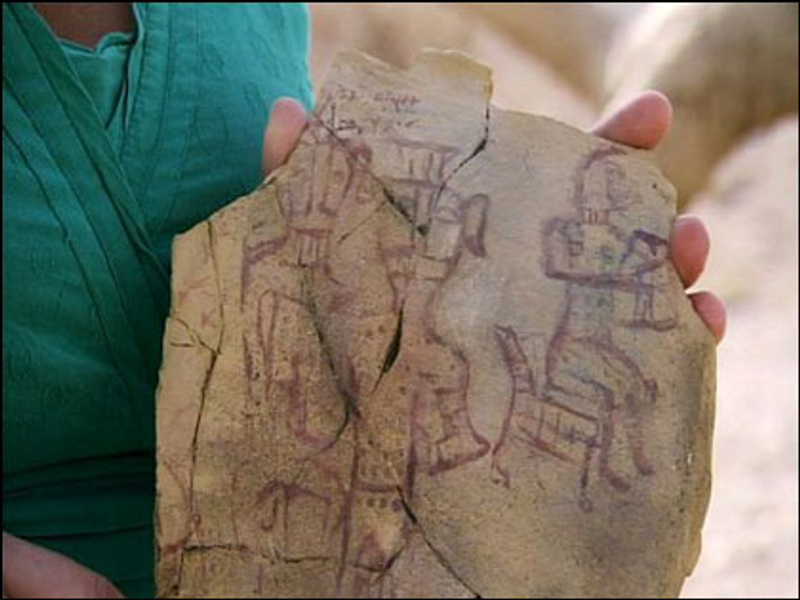 "Рисунки на разбитом сосуде, найденном в Кунтиллет-Аджруд на северо-востоке Синая и датированном началом XVIII в. до н. э., изображают три фигуры: стоящий на переднем плане мужчина, непосредственно за ним – женщина, на заднем плане – сидящий музыкант. Надпись гласит “Благословляю тебя именем Яхве из Самарии и его Ашеры”