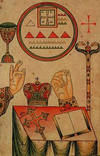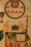 Однако тот и другой представляют, скорей всего, позднейшую стилизацию знаков более ранних. Ведь силуэт рыбы практически идеально повторяет абрис наконечника римской стрелы. «Якорь» же на изображениях из, например, катакомб Присцилы гораздо больше напоминает заряженный стрелой арбалет . Рядом изображено Мировое Древо о трех ветвях."