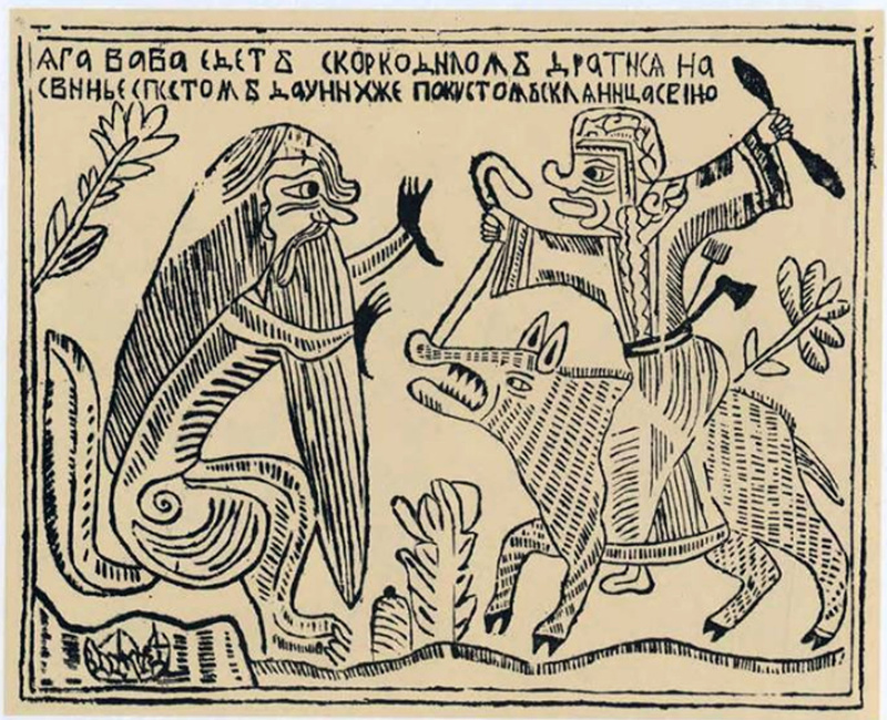 Баба-яга представлена в профиль, с кривым носом и высунутым языком; она сидит верхом на свинье; в правой руке держит возжи, в левой пест. Волосы ее распущены, за поясом заткнуты топор и грабли; на голове круглая шапка, отороченная мехом; рукава и подол платья обшиты каймой с узорами, на манер чухонских вышивок. Крокодил с человеческим лицом, лапами обезьяны и пушистым хвостом; он сидит слева на задних лапах; передние лапы он поднял на драку. Под ним корабль. На верху надпись: "яга-баба едет скоркодилом дратися на свинье спестом да унихже по(д) кустом скляница свино(м)".
