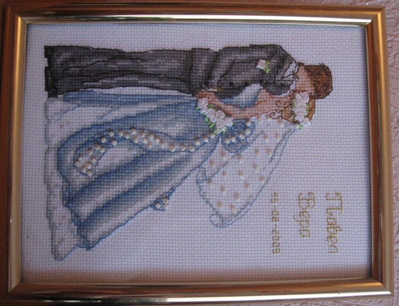 • Мои работы - это еще только проба пера. Набираю опыта потихоньку. Покажу свадебную вышивку, которую делала в подарок. Она небольшая, но на мой взгляд нарядная, украшена бисером. Не судите строго начинающую вышивальщицу! :смущ: