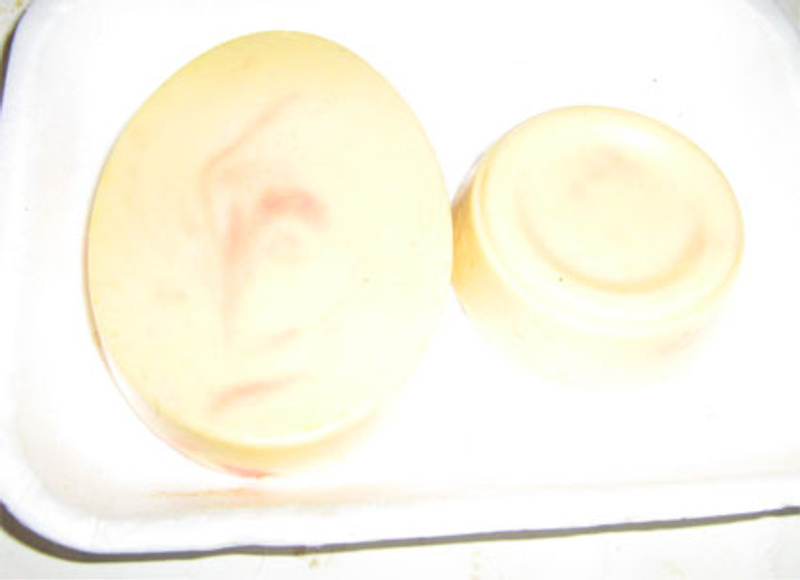 В закромах нашлось масло репейное, масло пихтовое и детское мыло НК с зайчиками и краски для яиц с Пасхи остались. На все про все (от начала до замерзания) ушел всего час. Пихта что-то выветрилась уже (но запах у масла был не айс), и краска в мыле расплылась за ночь. Мылится нормально, и запах как у просто мыла.