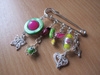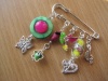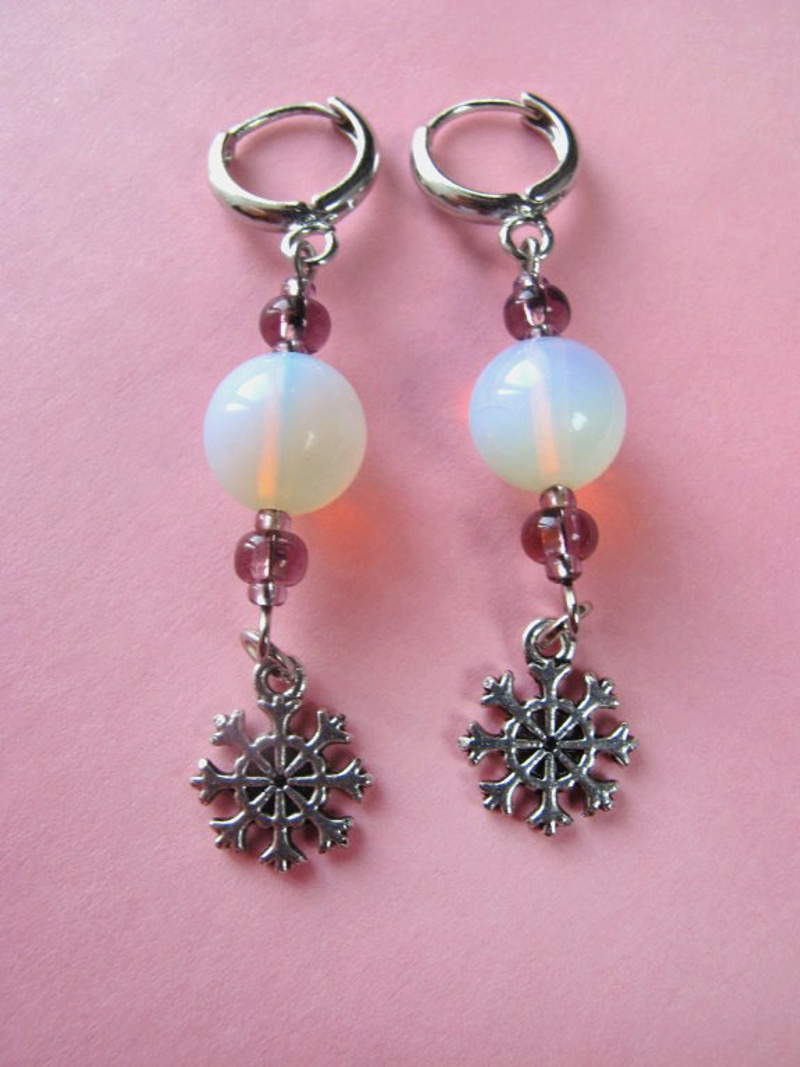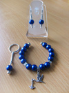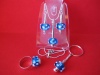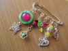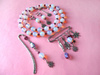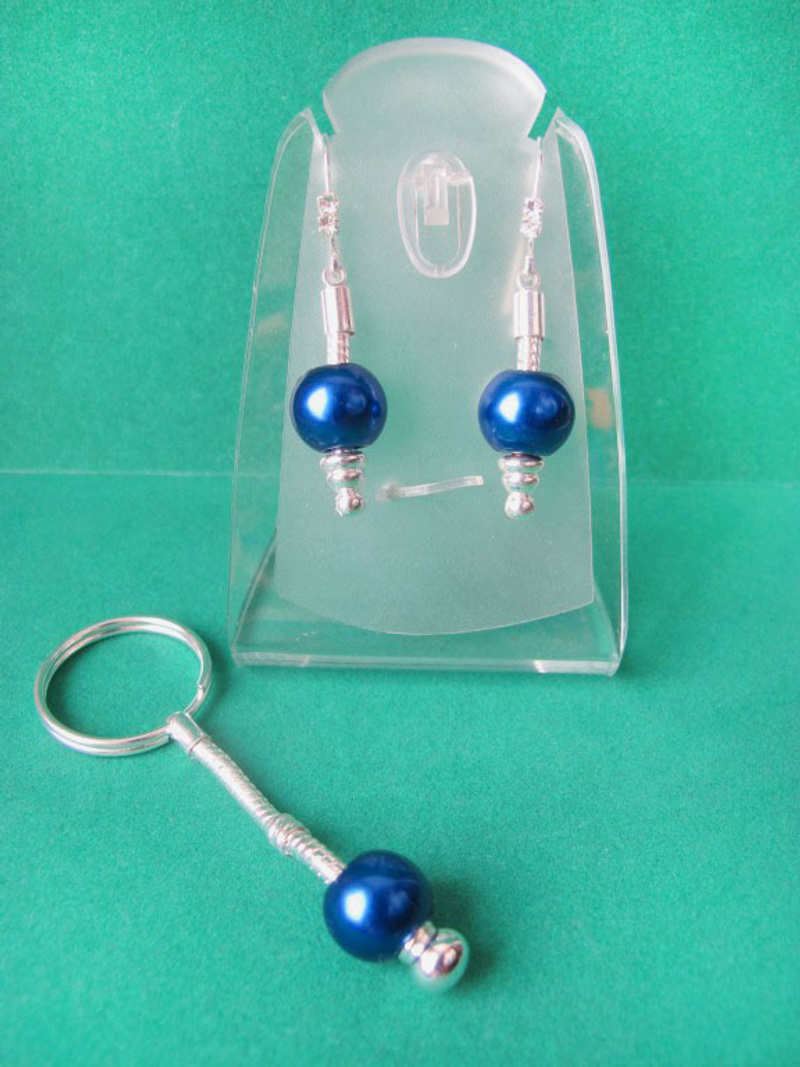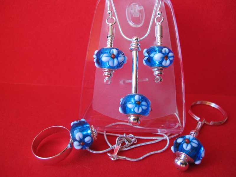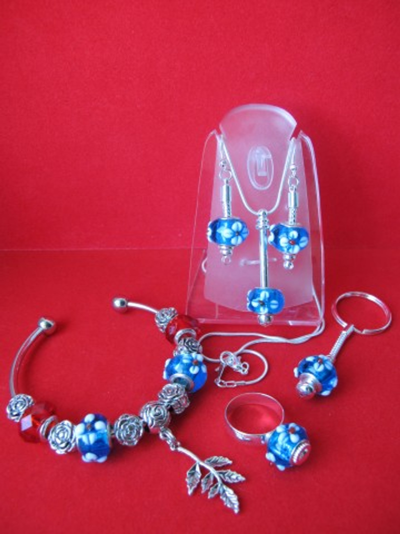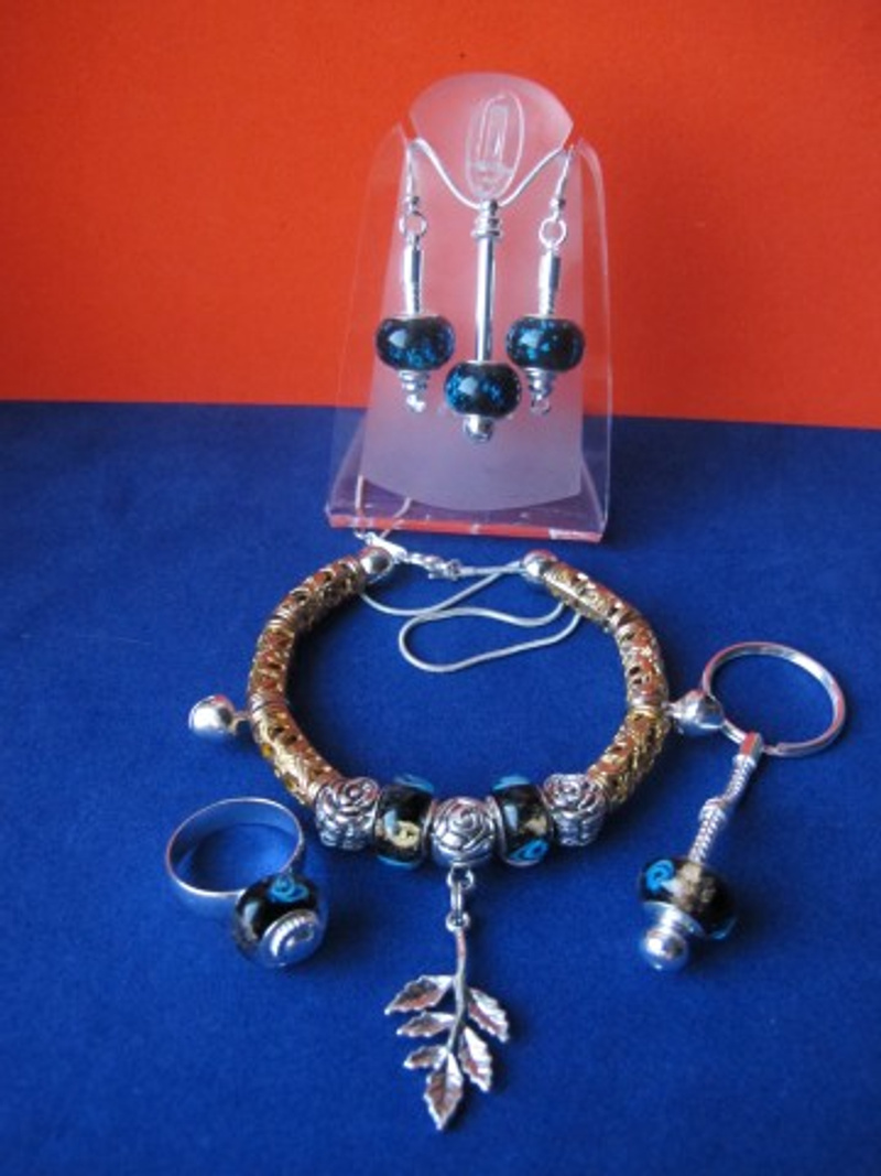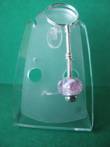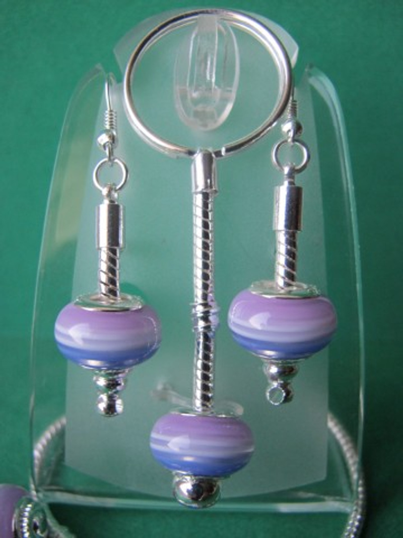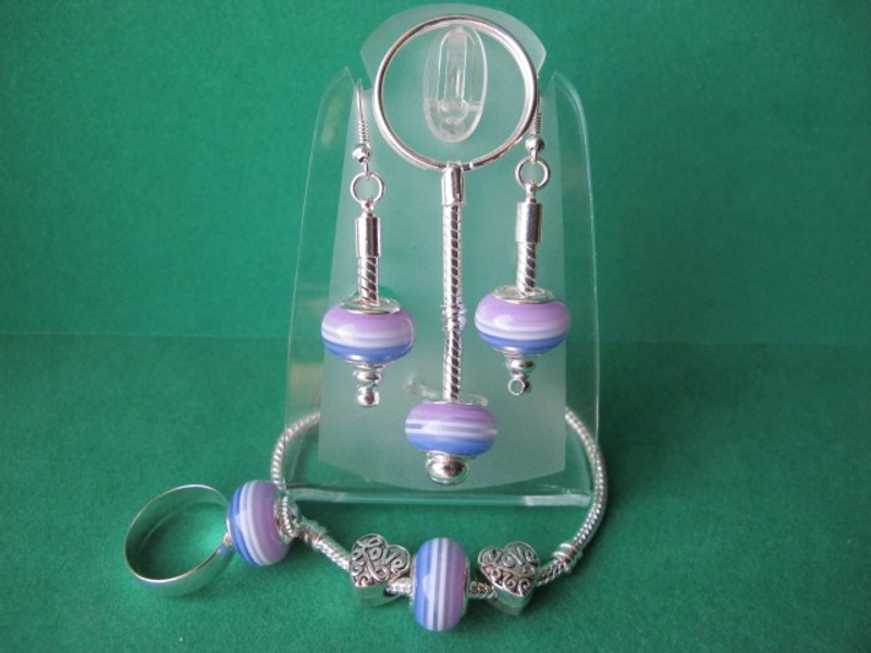 посеребренная фурнитура в стиле ПАНДОРА: основа для браслета с защелкой и фирменной надписью PANDORA, основы для кольца, серег и брелка, со спирально закручиваюшимися наконечниками-шариками. 2. Комплект "СИРЕНЬ В ЦВЕТУ" в стиле ПАНДОРА - фото крупным планом: серьги, и брелок