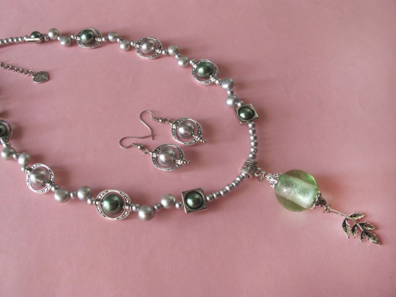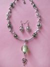 двухярусное ожерелье и серьги Материалы: декоративная цепочка нежно-салатового цвета с алмазной гранью, перламутровые бусины 10 мм.- искусственный жемчуг белого цвета с радужными оттенками, коннекторы "Цветочек"
