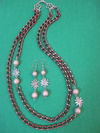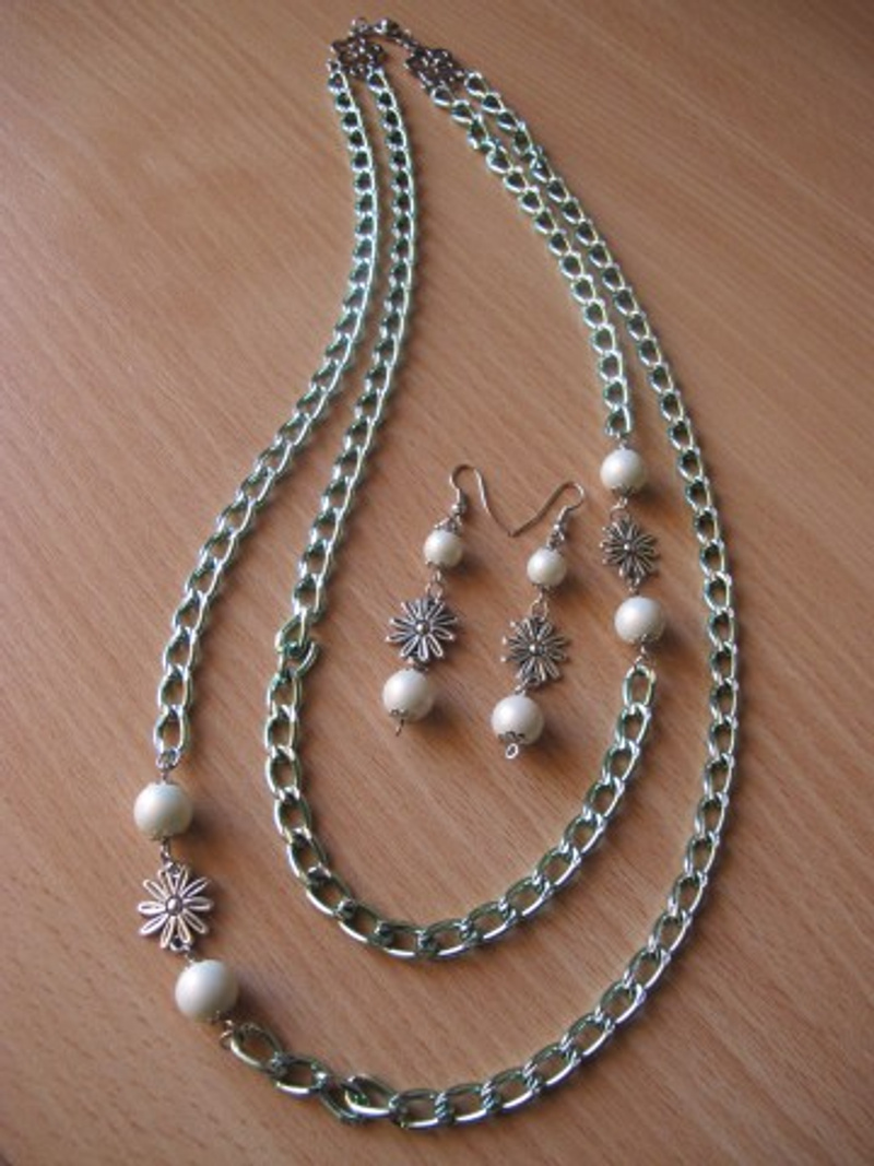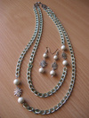 двухярусное ожерелье и серьги Материалы: декоративная цепочка под медь с алмазной гранью, перламутровые бусины 10 мм. - искусственный жемчуг цвета кофе с радужными оттенками, коннекторы "Цветочек" и "Пятигранник", соединительные кольца, швензы, шапочки для бусин, замочек с кнопочкой.