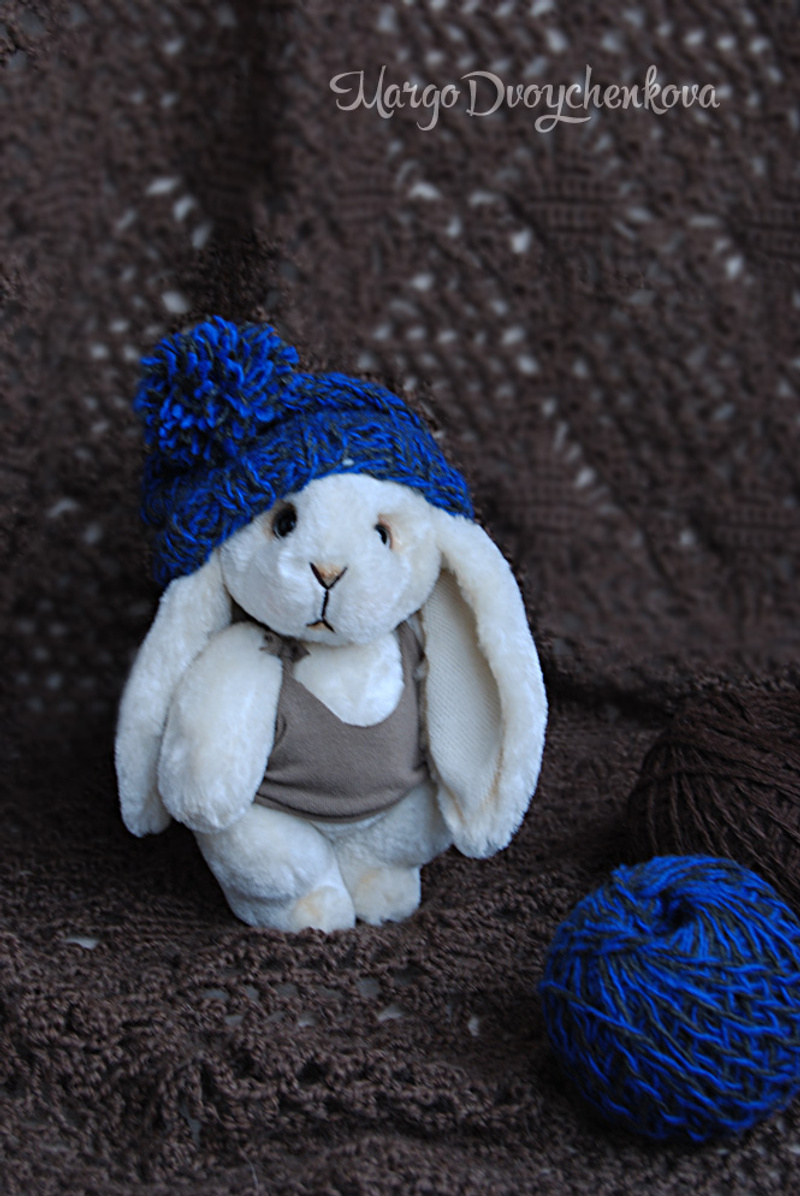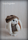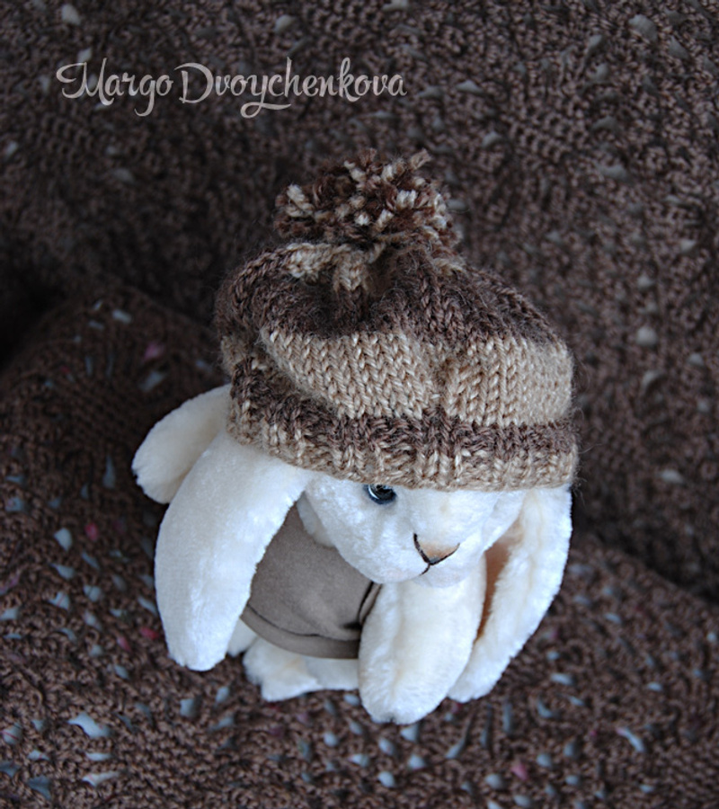 Зая одета в маечку из трикотажа и вязанный беретик с помпоном.