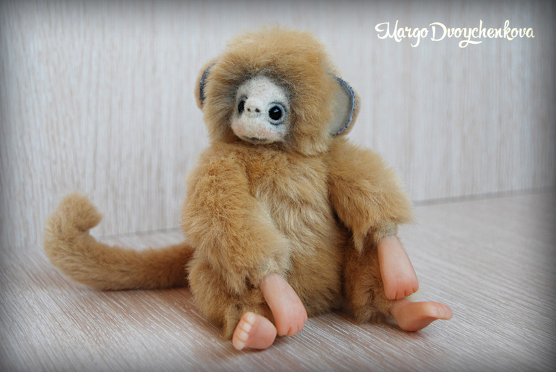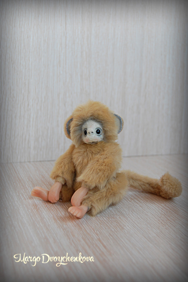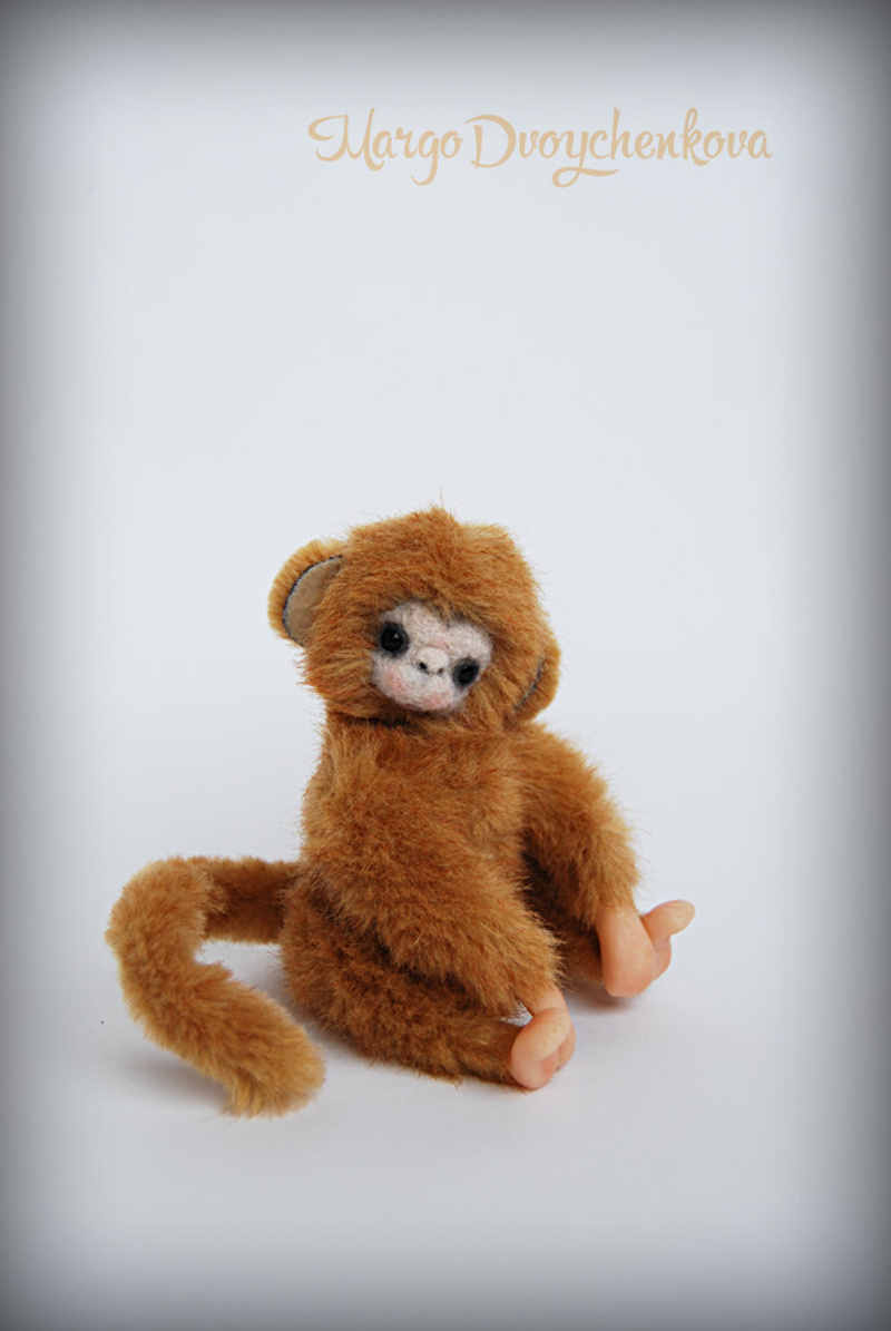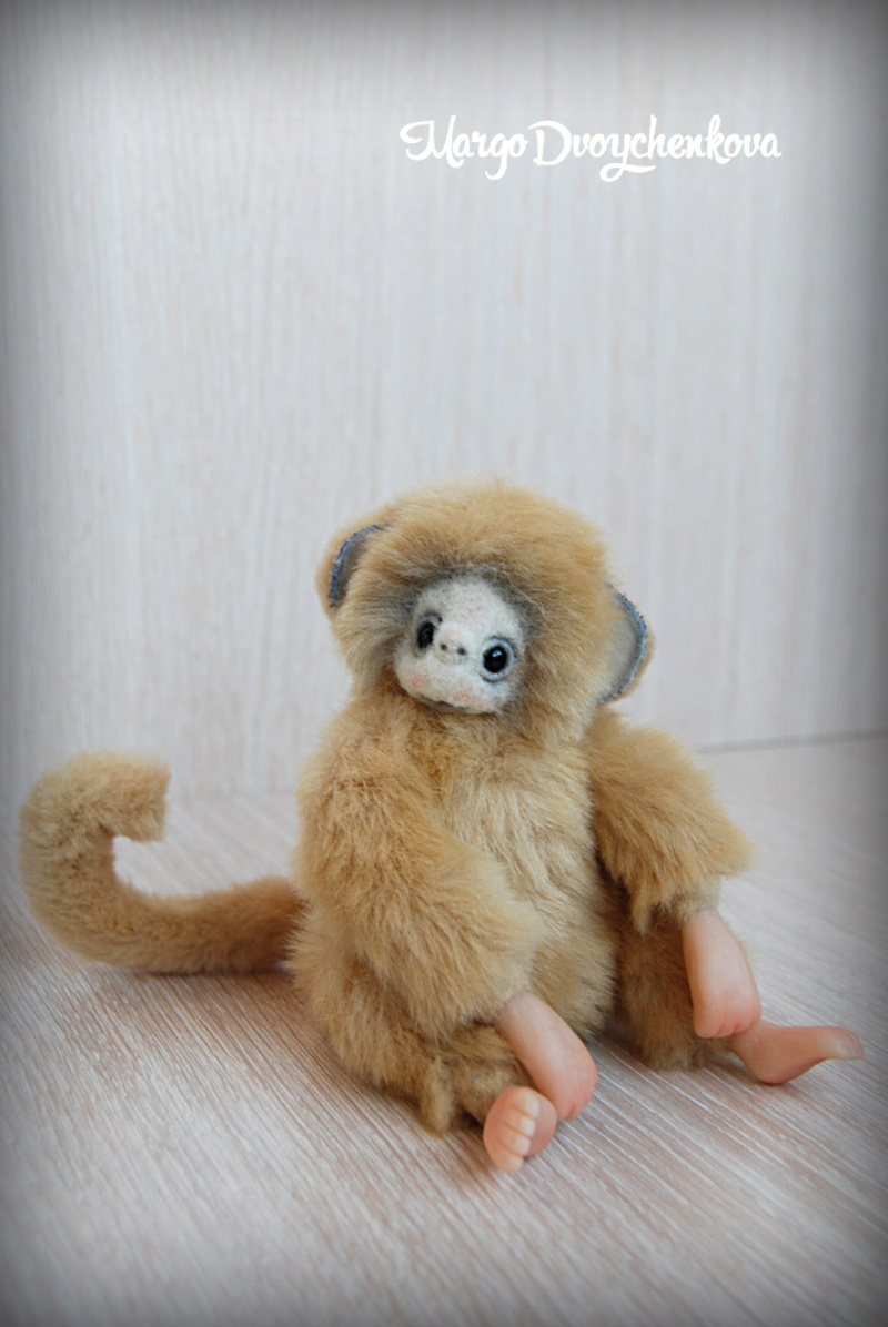 Обезьянка выполнена из искусственного меха производство Германия, внутреннее ушко из миништофа, набивка синтепух, утяжелена стеклянным гранулятом, глазки стекло, крепления все подвижные (10 шплинтов), в лапках и хвостике проволочный каркас, тонировка сухой пастелью и текстильным маркером.