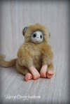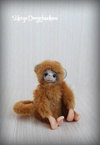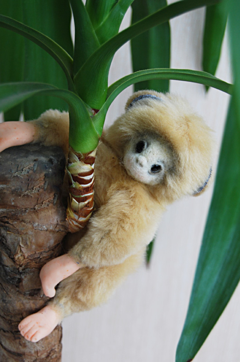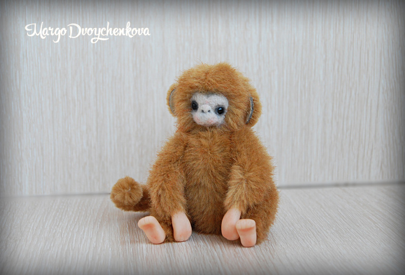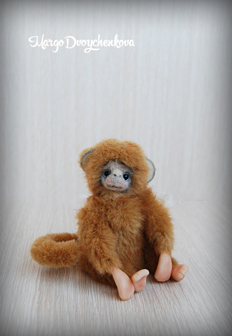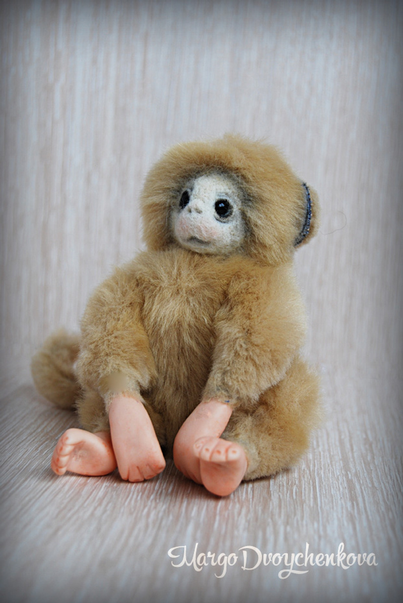 Обезьянка выполнена из искусственного меха производство Германия, внутреннее ушко из миништофа, набивка синтепух, утяжелена стеклянным гранулятом, глазки стекло, крепления все подвижные (10 шплинтов), в лапках и хвостике проволочный каркас, тонировка сухой пастелью и текстильным маркером.