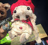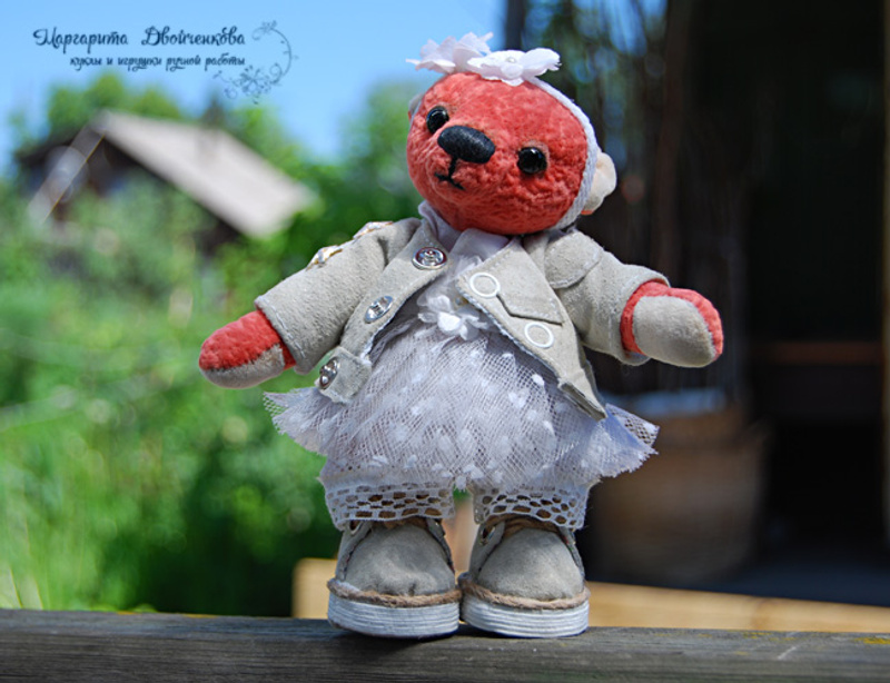 Зефирчик выполнен из искусственного меха Schulte, набивка синтепух, утяжелён металлическим гранулятом, 6 шплинтов, глазки стеклянные, затонирован художественным маслом. Одет Зефирчик, как и Тася, в "хипповскую" маечку и вязанную шапочку с помпоном.