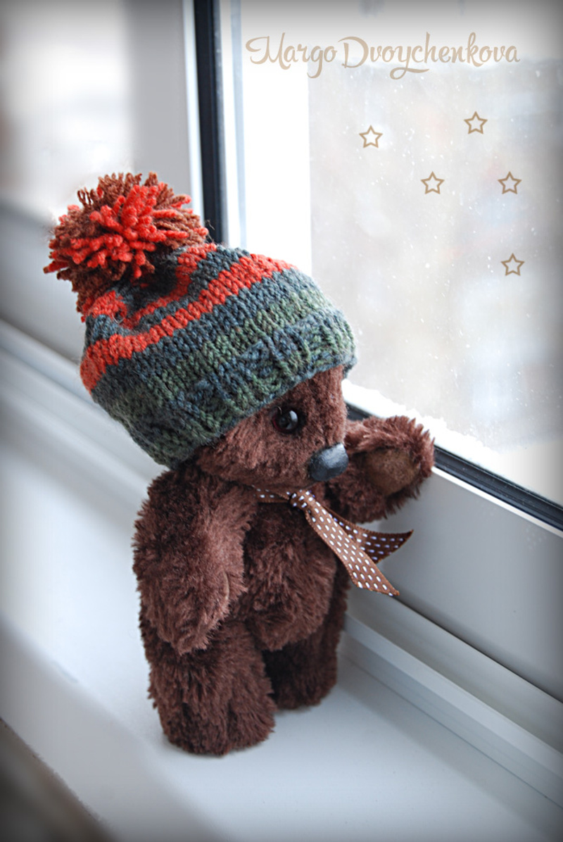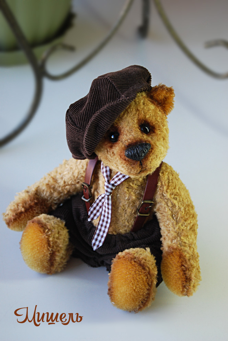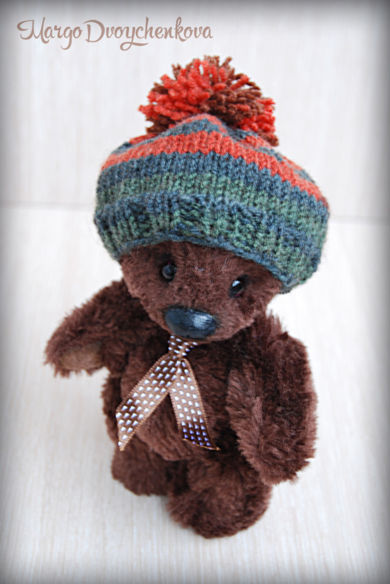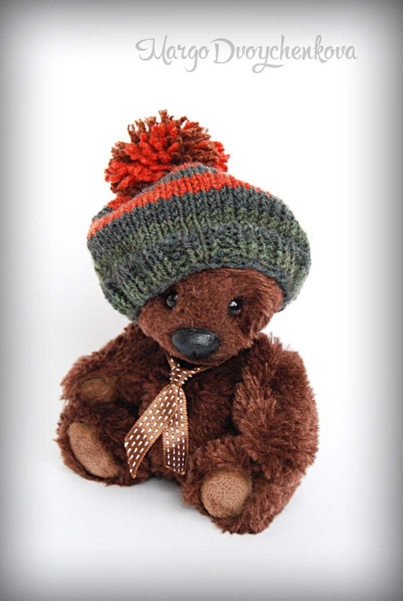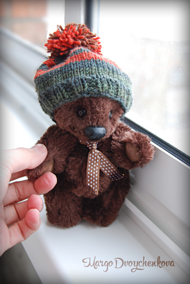 Мишка выполнен из искусственного меха, ладошки,пяточки и внутреннее ушко из миништофа, набивка синтепух, утяжелён металлическим гранулятом, 6 шпинтов, глазки стекло, носик из пластики, тонировка художественным маслом, пастелью и текстильным маркером. Одет мишаня во "взрослый" галсткук и вязанную шапочку с помпоном.