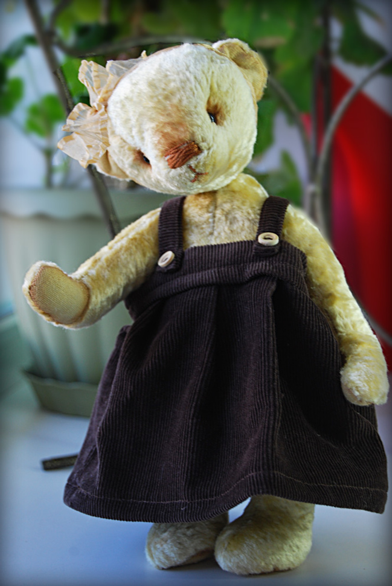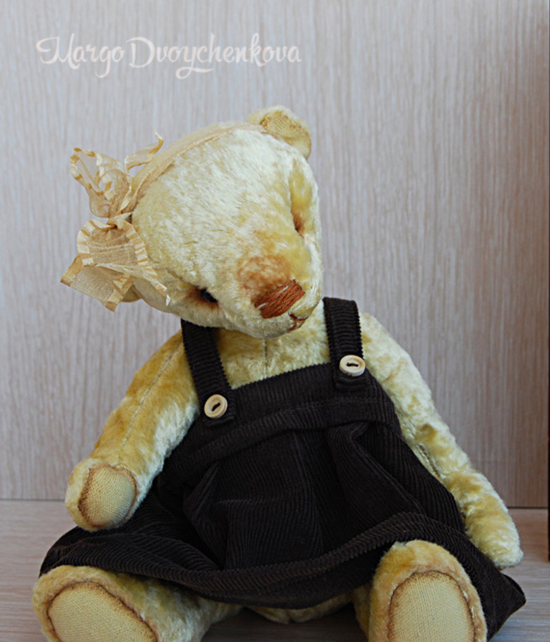 Злата одета в сарафанчик из мелкого вельвета шоколадного цвета, застёжки на деревянных пуговичках. Сарафан снимается. На "золотой" головушке у мишки капроновая жатая ленточка.