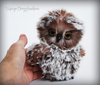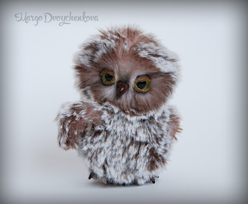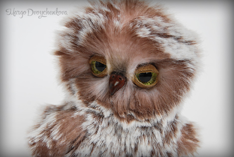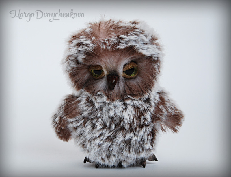 Совёнок выполнен из немецкого искусственного меха Schulte, внутренние крылышки из миништофа, набивка синтепух, немного утяжелен металлическим гранулятом, головка на двойном шплинте, стеклянные расписанные вручную глазки, веки подвижные, клювик и коготки из пластики, крылышки армированы, тонировка маркером и пастелью.