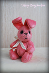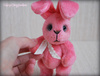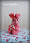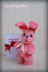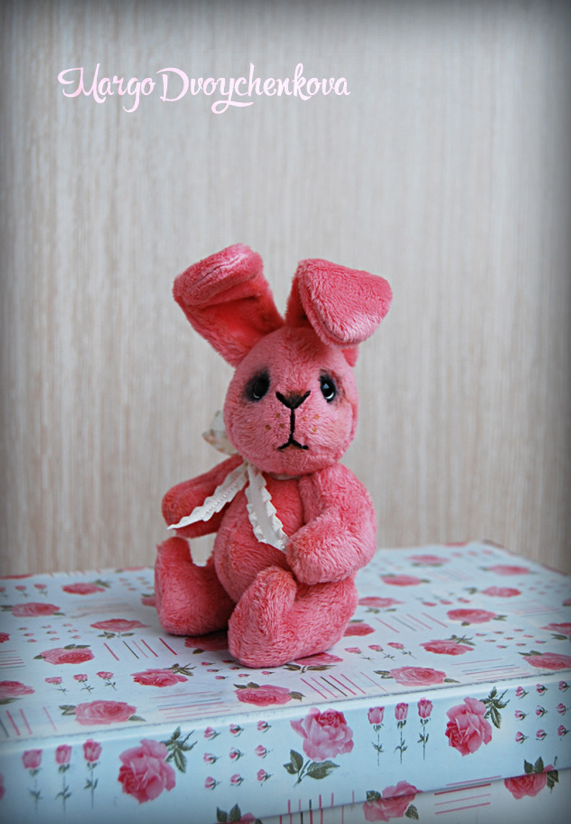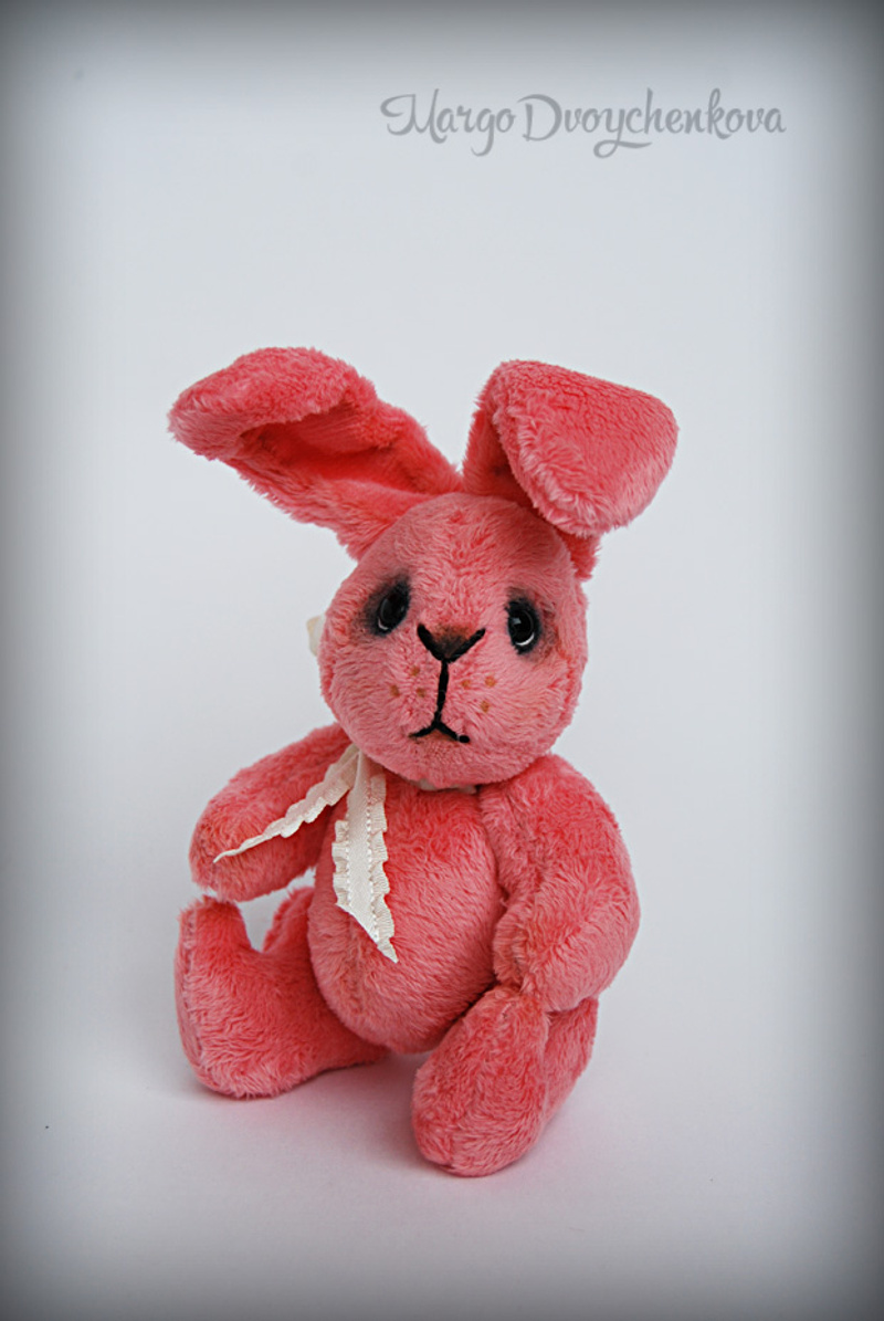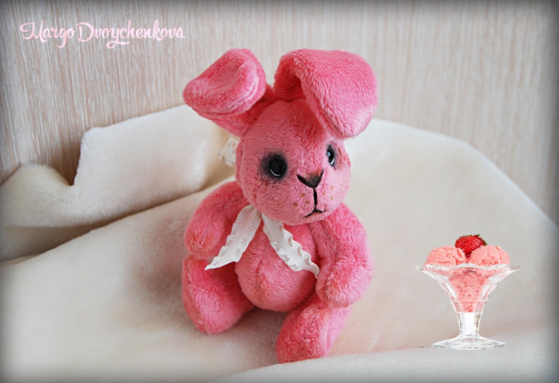 Зая выполнен(а) из искусственного меха Schulte аппетитного клубничного цвета, набивка синтепух, утяжелен(а) металлическим гранулятом, 6 шплинтов, глазки стекло, носик вышит, тонировка текстильным маркером и пастелью.
