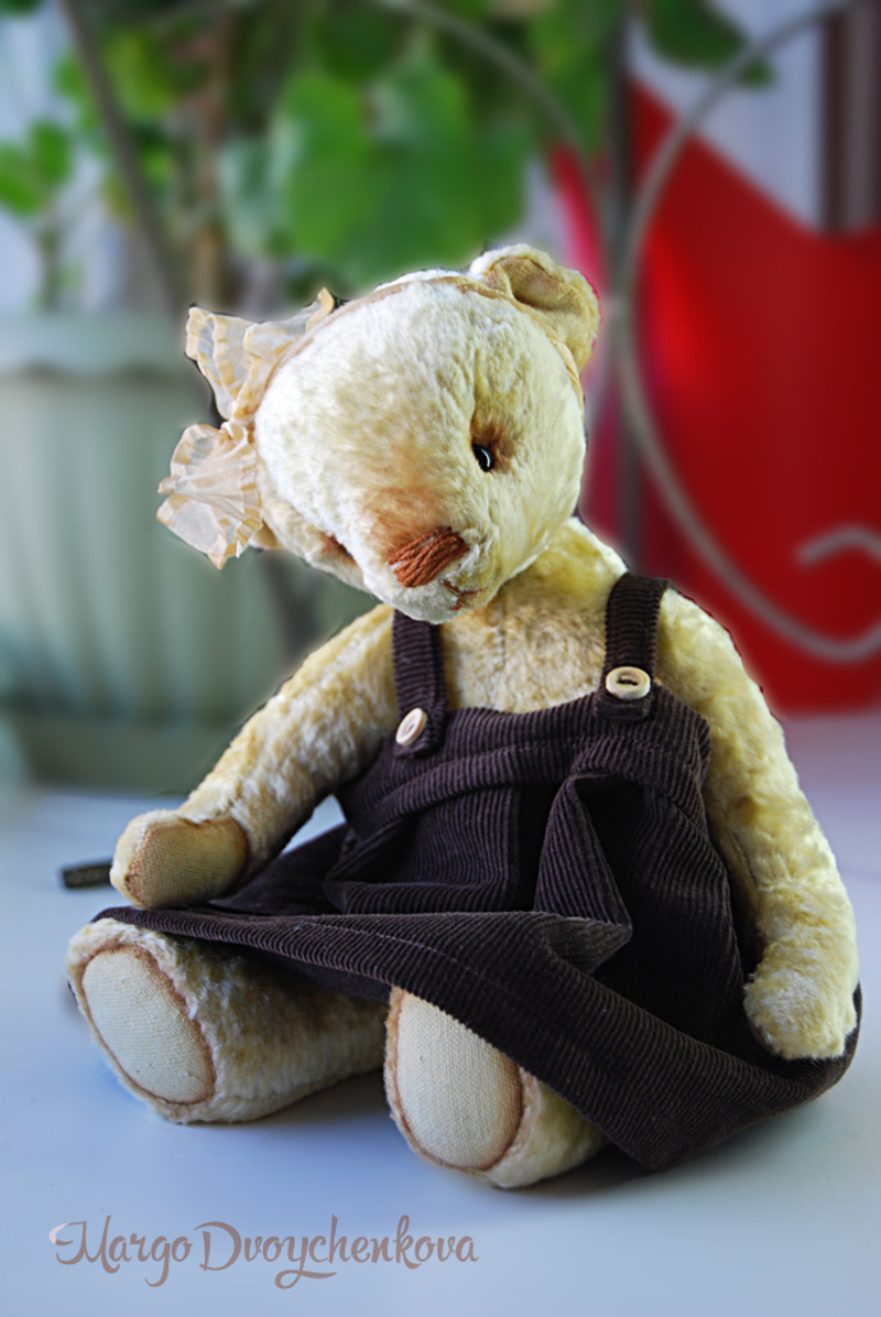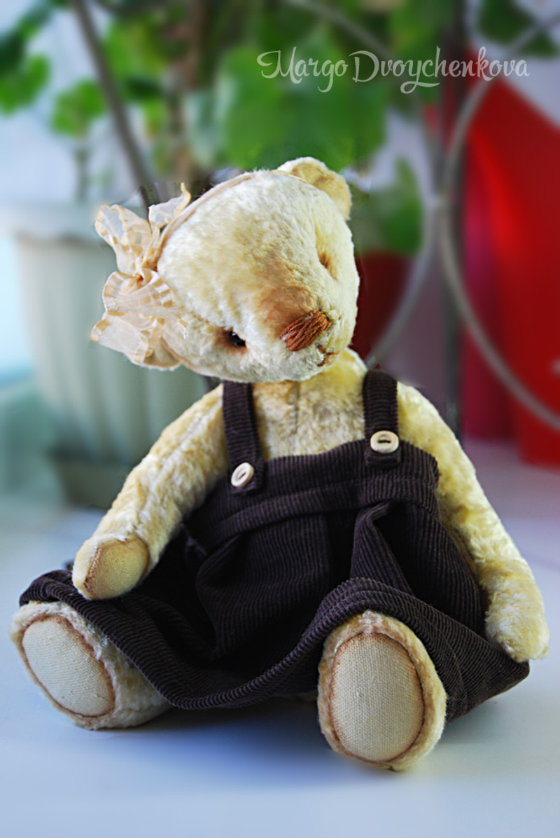 Мишка Злата пошита из настоящего винтажного плюша, немного осветленного вручную, набита опилочками, утяжелена металлическим гранулятом, затонирована художественным маслом, крепления подвижные (6 шплинтов), глазки стекло, носик вышит Ирисом. Рост мишки 27 см. Может стоять самостоятельно, но не очень устойчиво, с бОльшим удовольствием сидит))).