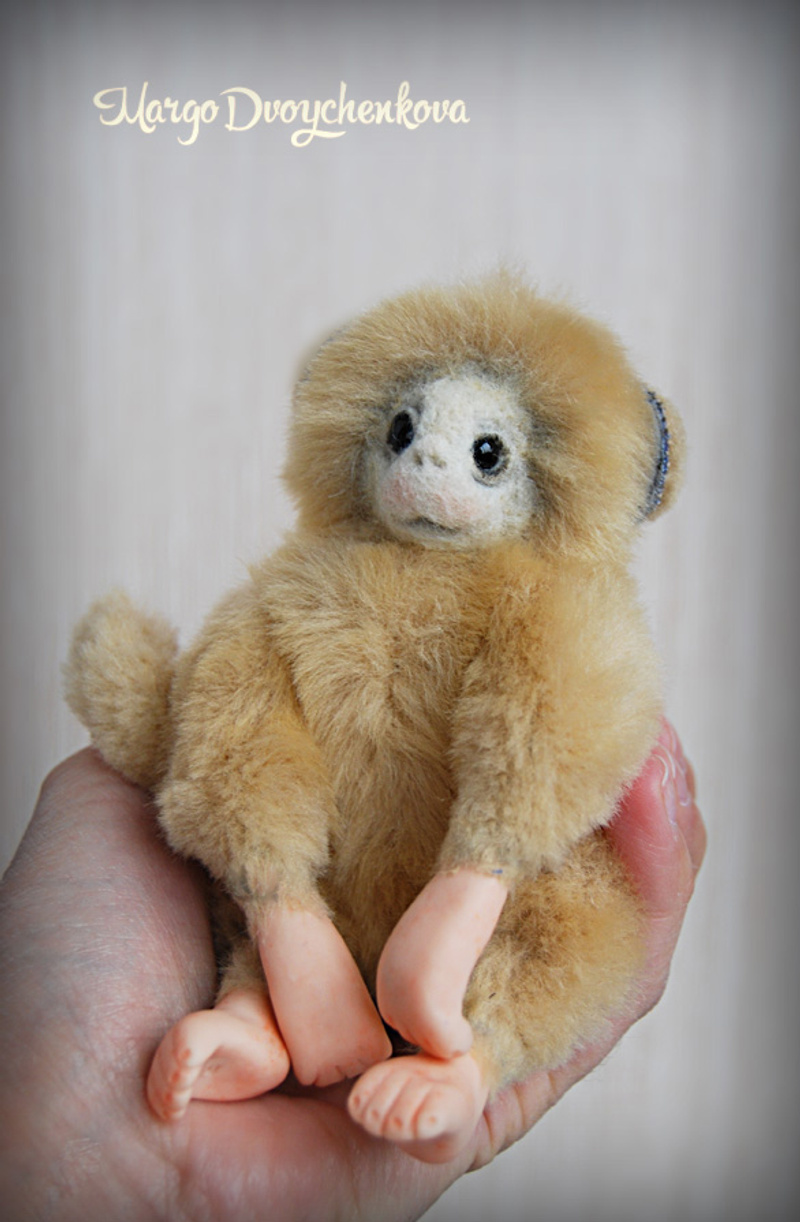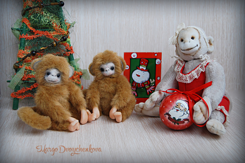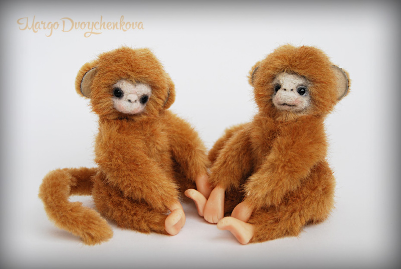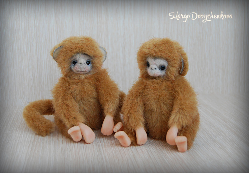 Обезьянки выполнены из немецкого искусственного меха, миништофа, набивка синтепух и шерсть для валяния, утяжелены металлическим гранулятом, 10 шплинтов, глазки стекло, ступни и кисти ручек из запекаемой пластики. Тонировка сухой пастелью.