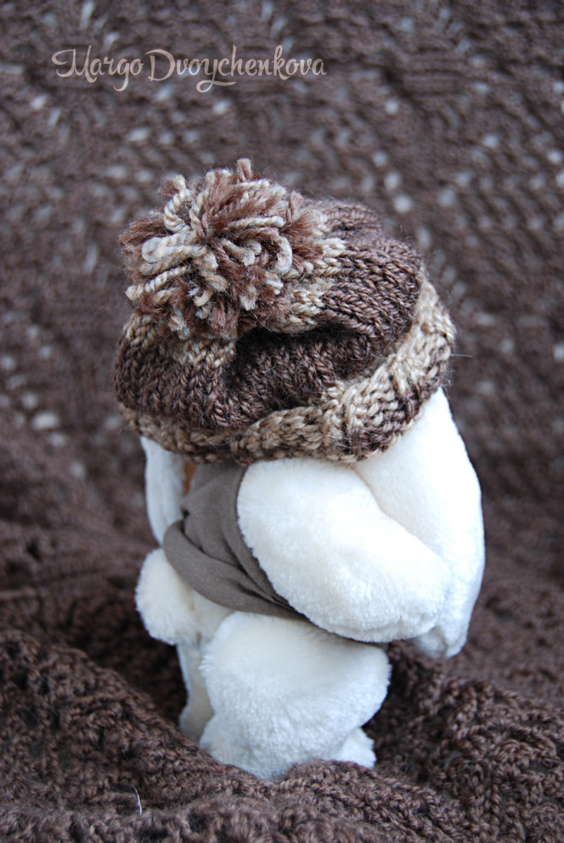 Одета в вязаную одежду (чтобы не мёрзнуть))) : кофточку и шапочку с дырочками для ушек и помпоном.