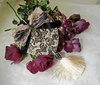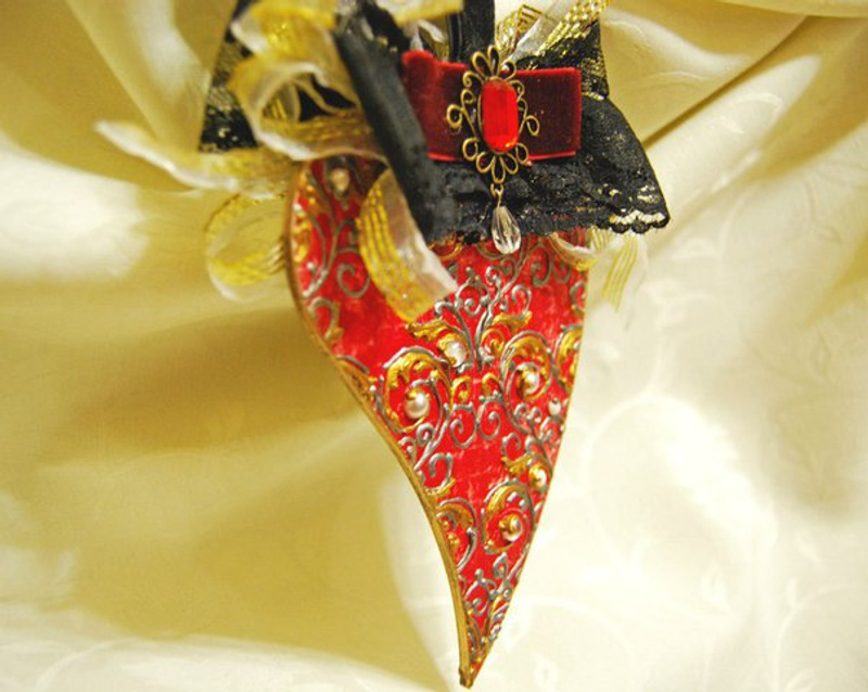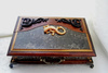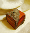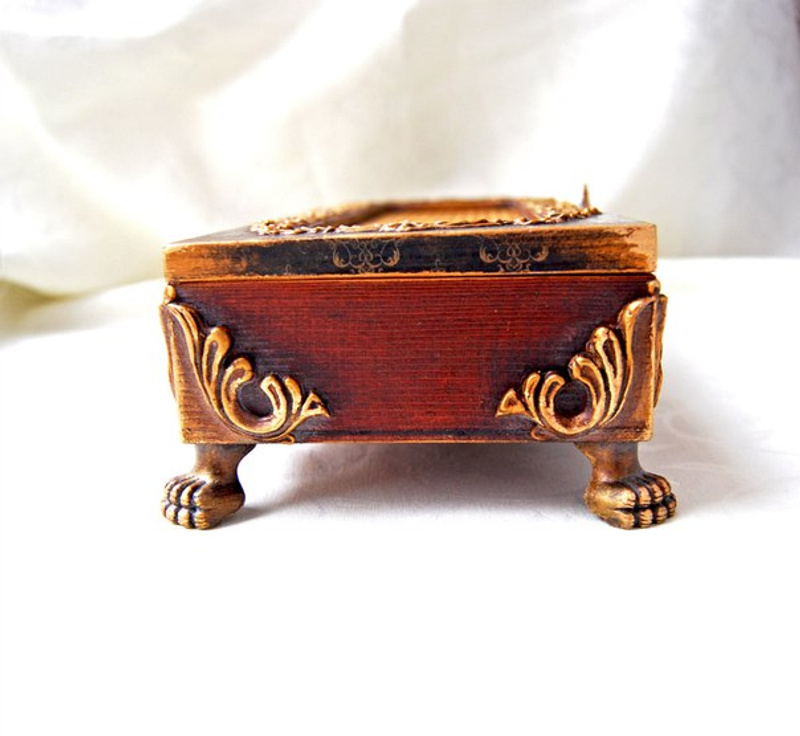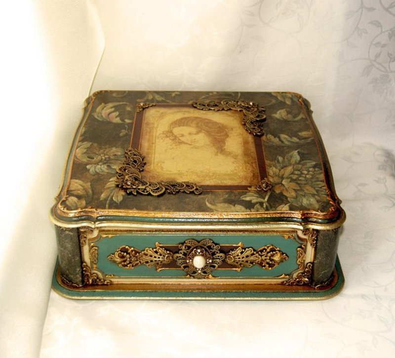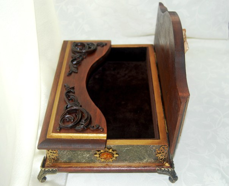 Шкатулка выполнена из натурального дерева подвергшегося многослойному морению и объёмной росписи имитирующей металл. Внутри дно и крышка обтянута бархатом, стенки декорированы в технике декупаж