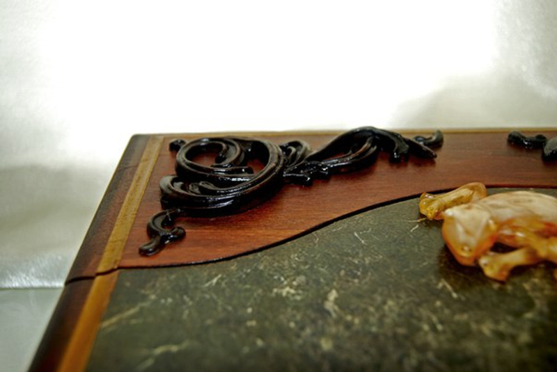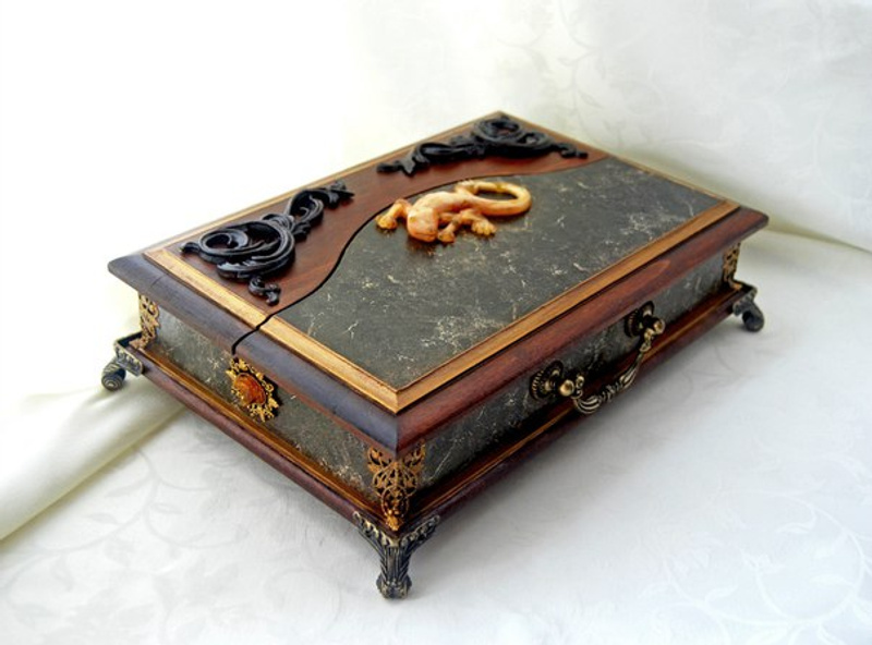 Настольный секретер для хранения важных аксессуаров. Благородная вещь в солидном исполнении. Ящерица и медальоны из янтаря. Морение дерева с имитацией резьбы, отделка бархатом. Золочение и патина.