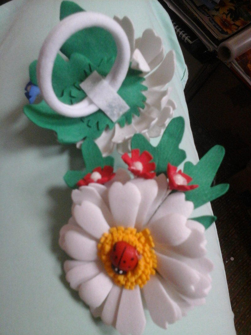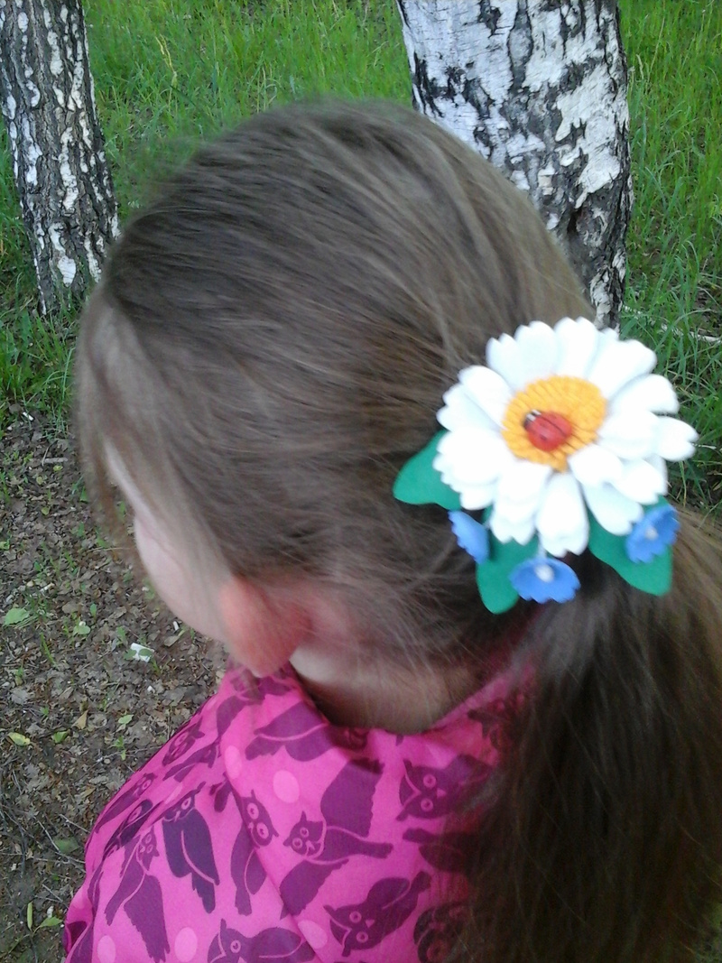 Вот такие красивые ромашки из фоамирана.. Фоамиран не боится воды, не мнётся. Можно мыть в мыльном растворе. Ромашки -резиночка, остальные цветы-металлическая заколка , цвет любой
