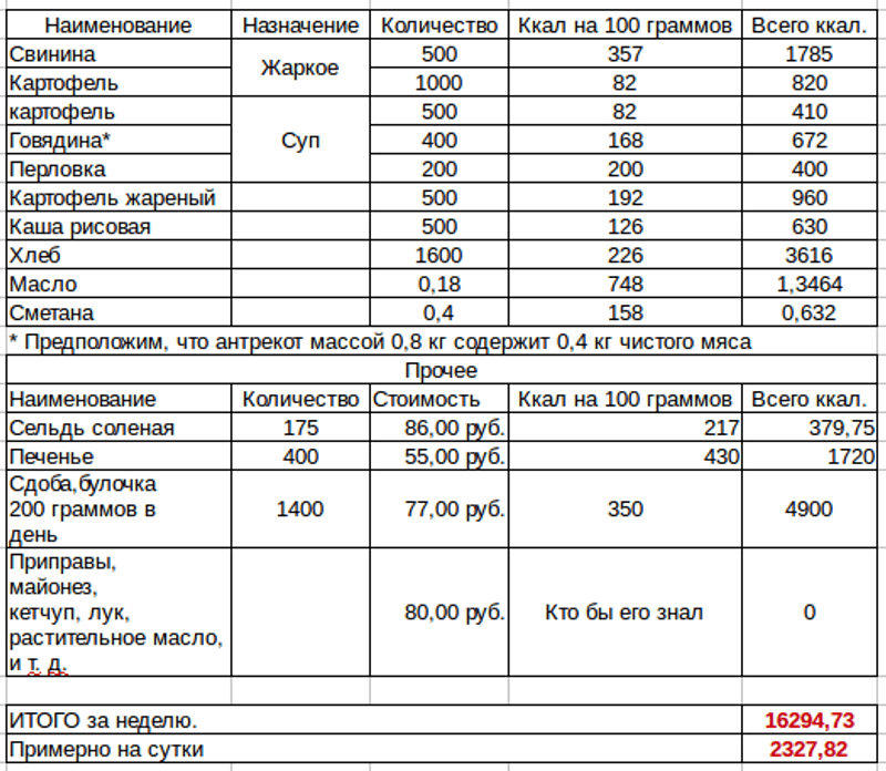 И ещё! Я забыл посчитать калорийность сыра, который использую для бутербродов. Откорректированная таблица в присоединенном файле.