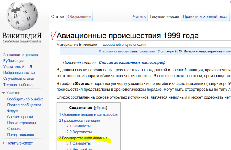 (...)я ещё раз (3-й раз) прошу вас привести источник данных,Статья : "Авиационные происшествия 1999г" , раздел : "Государственная авиация" (гос. сектор - как показатель состояния авиа, там всё строже, чем у коммерсов, по крайней мере в США). Википедия. (считайте флаги США в таблице).