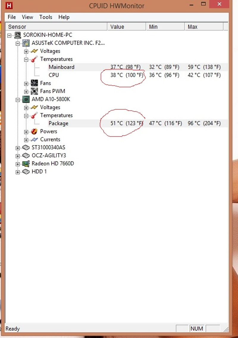 Я бы решил решить, что второе это проц.Логично, но что то не так, там макс температура всегда около 100град, он давно сгорел бы.