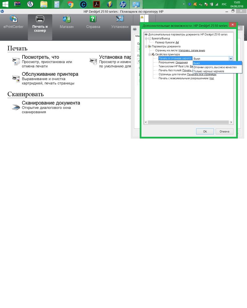 Но! После установки печати только черными чернилами, обратно вернуть печать в цвете не могу! Просто вкладка с цветом исчезла... Есть варианты: печать с оттенками серого вкл или выкл, и ч.белая...