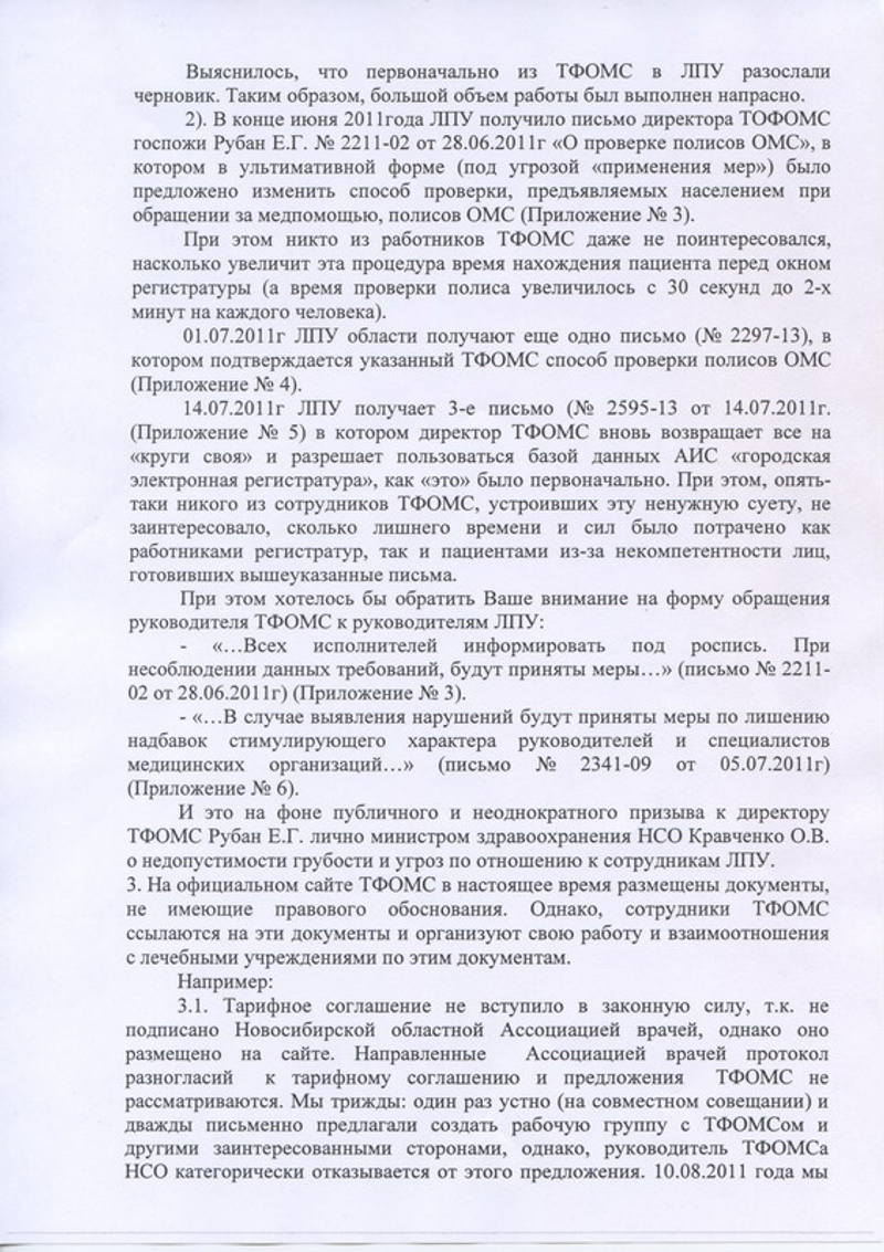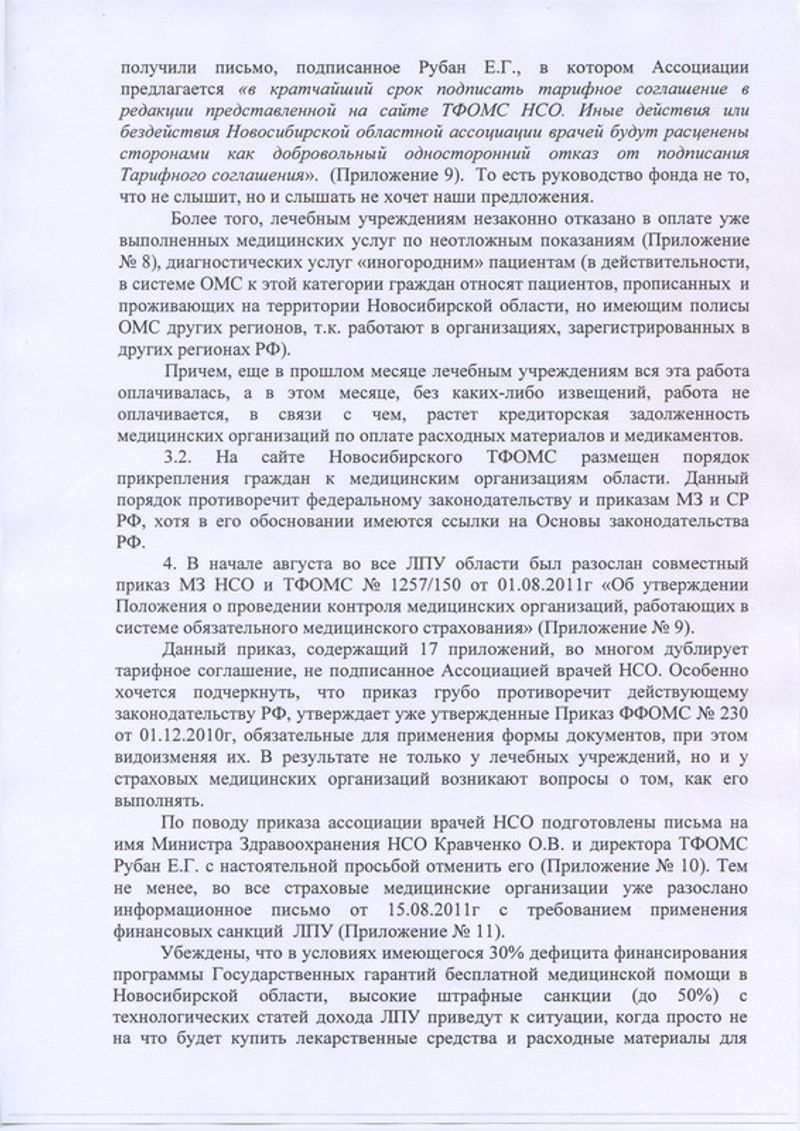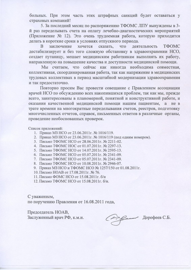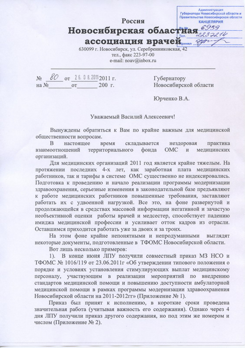 Правление Новосибирской областной ассоциации врачей направило письмо (стр. 1, стр. 2, стр. 3, стр. 4) губернатору Новосибирской области В.А.Юрченко, в котором выказало озабоченность отношениями, сложившимися между ТФОМС и медицинскими учреждениями.