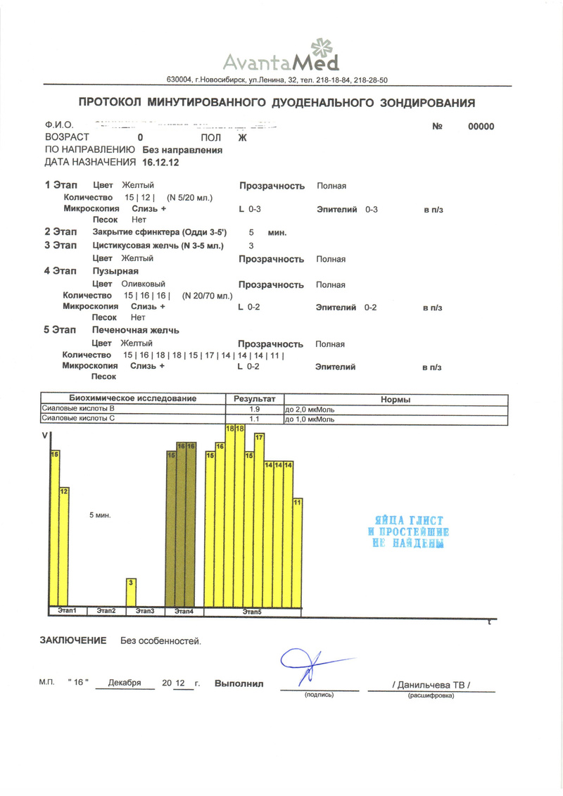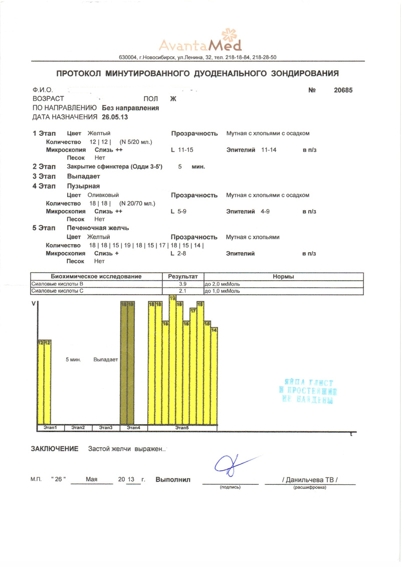 Через 4 месяца после травления (через 2 после окончания желчегонной терапии после травления) – без особенностей и желчь прозрачная.