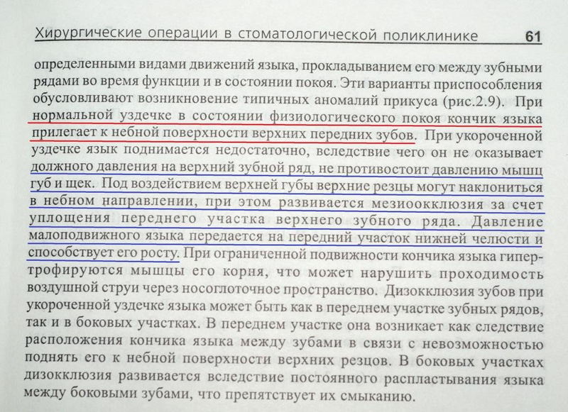 Я считаю,что МОЖЕТ БЫТЬ из 100 человек 1-2 это и надо..может быть. Пока я обхожусь без этой процедуры. Вы писали- "недостаточная длина уздечки языка, язык, лежащий на дне полости рта, формирует большой размер нижней челюсти, обратная сагиттальная щель, дизокклюзия во фронтальном участке, атрофические изменения в пародонте;"
